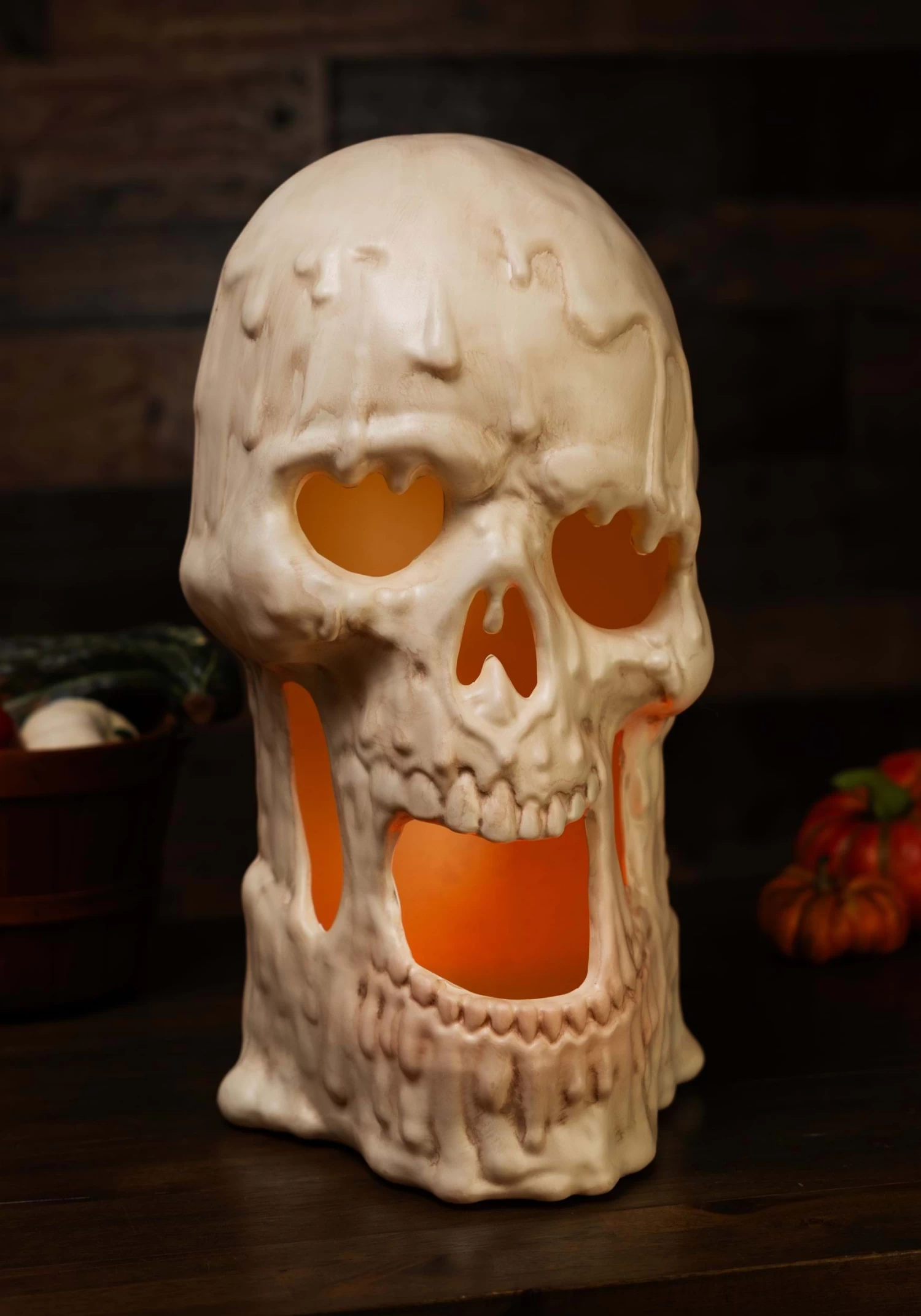 The creepy yet captivating 20″ Light Up Melting Skull Decoration is molded from plastic to represent an open-jawed skull seemingly melting away.