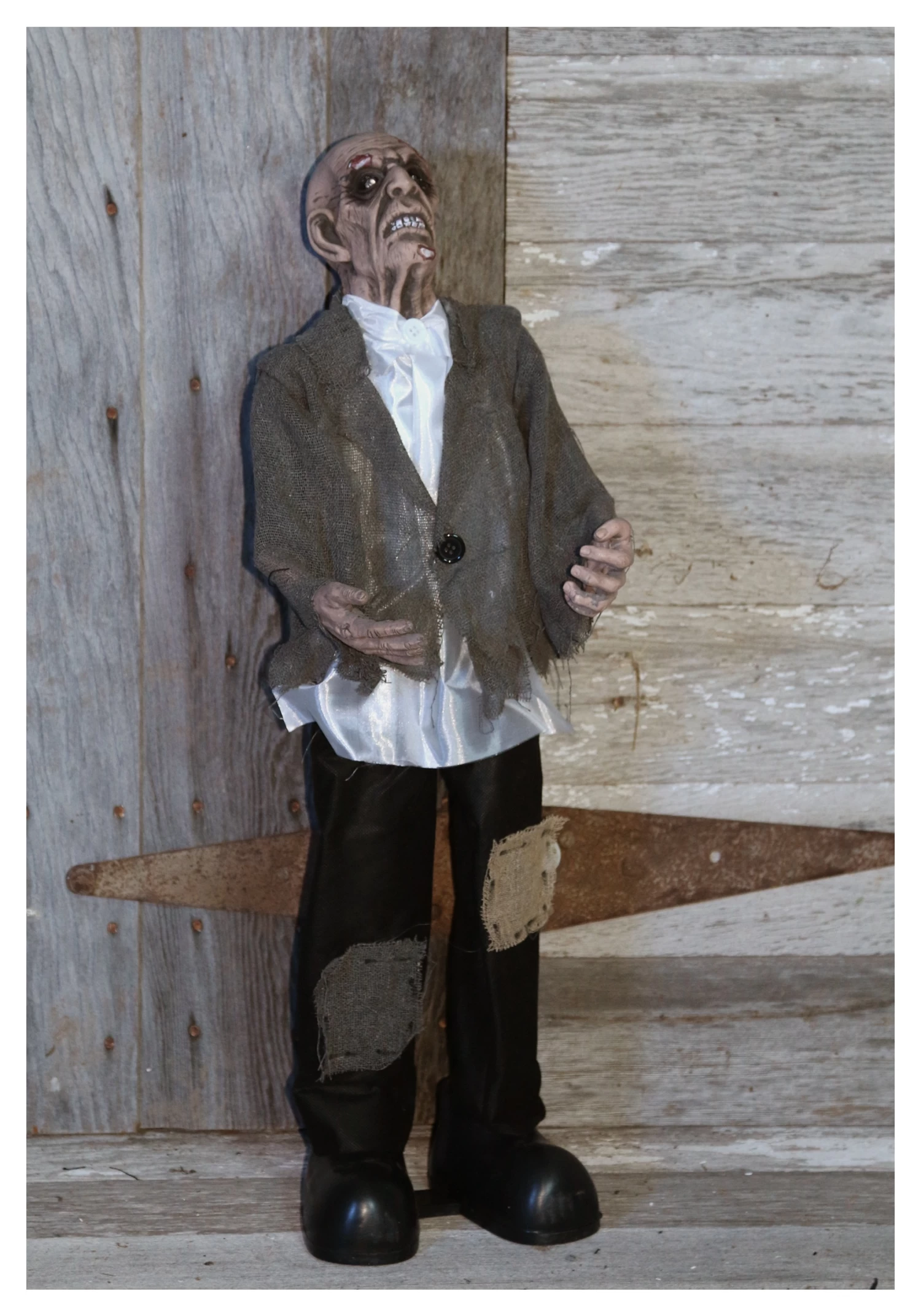 You can wonder what zombies do in their spare time all you want, but as soon as you take a closer look they will go right back to trying to bite your face off, just like this Grey Moving Zombie Prop! Standing 30 inches tall, this zombie doesn’t come in short on scares. His tattered suit and pants mean he’ll meet the dress code for almost any party you invite him to, and when he’s activated he’ll frighten the heck out of everyone with his creepy movements and spooky laugh! Just be sure to feed him before the guests arrive.