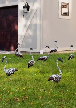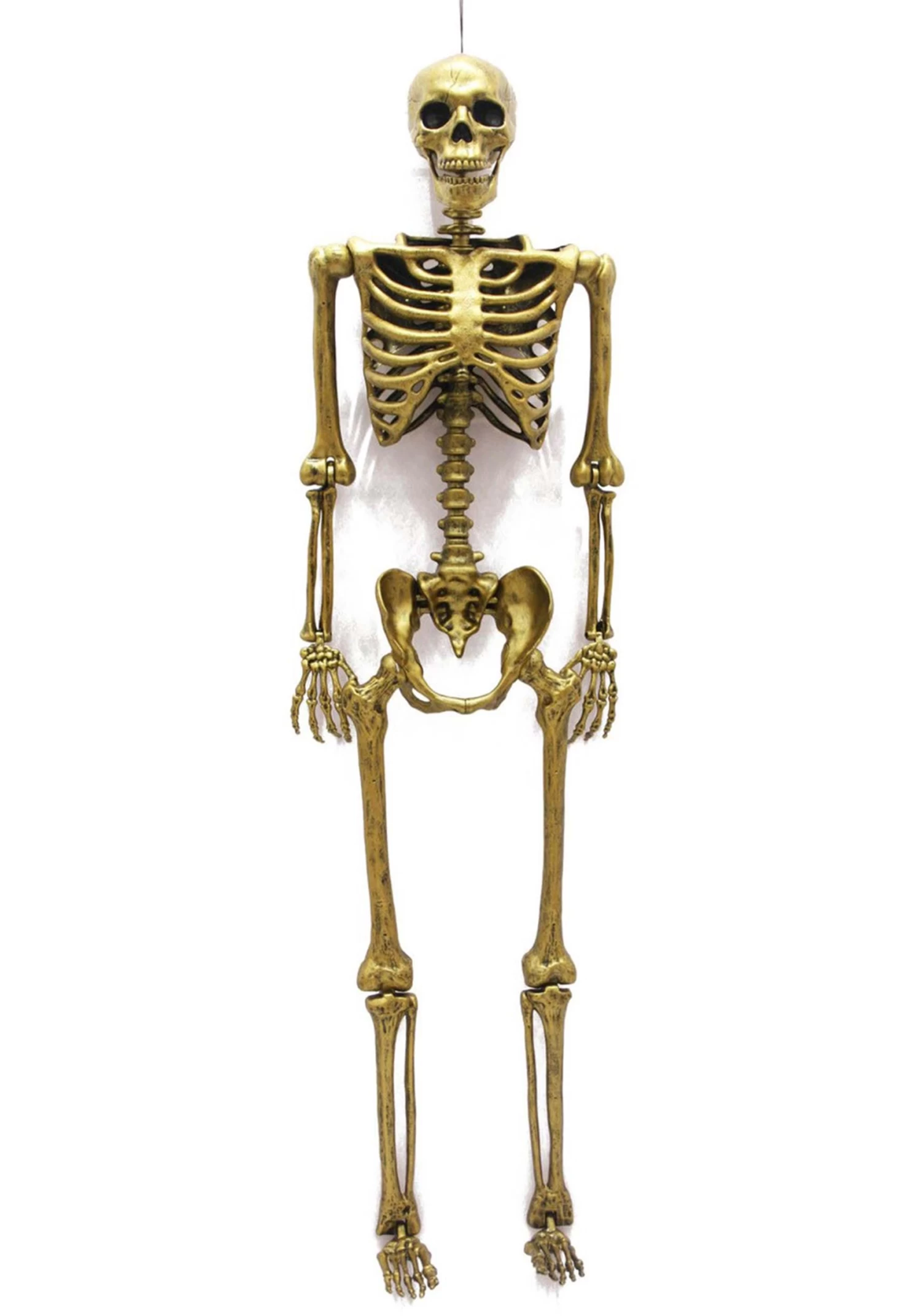 This poseable golden skeleton is five feet tall and has joints in its arms and legs and jaw that allow you to pose the skeleton just so. It can also hang from a hook by a loop at the top of its head. Create an element of spooky splendor in an indoor or outdoor display! You’ll look forward to breaking out this treasure every Halloween season!