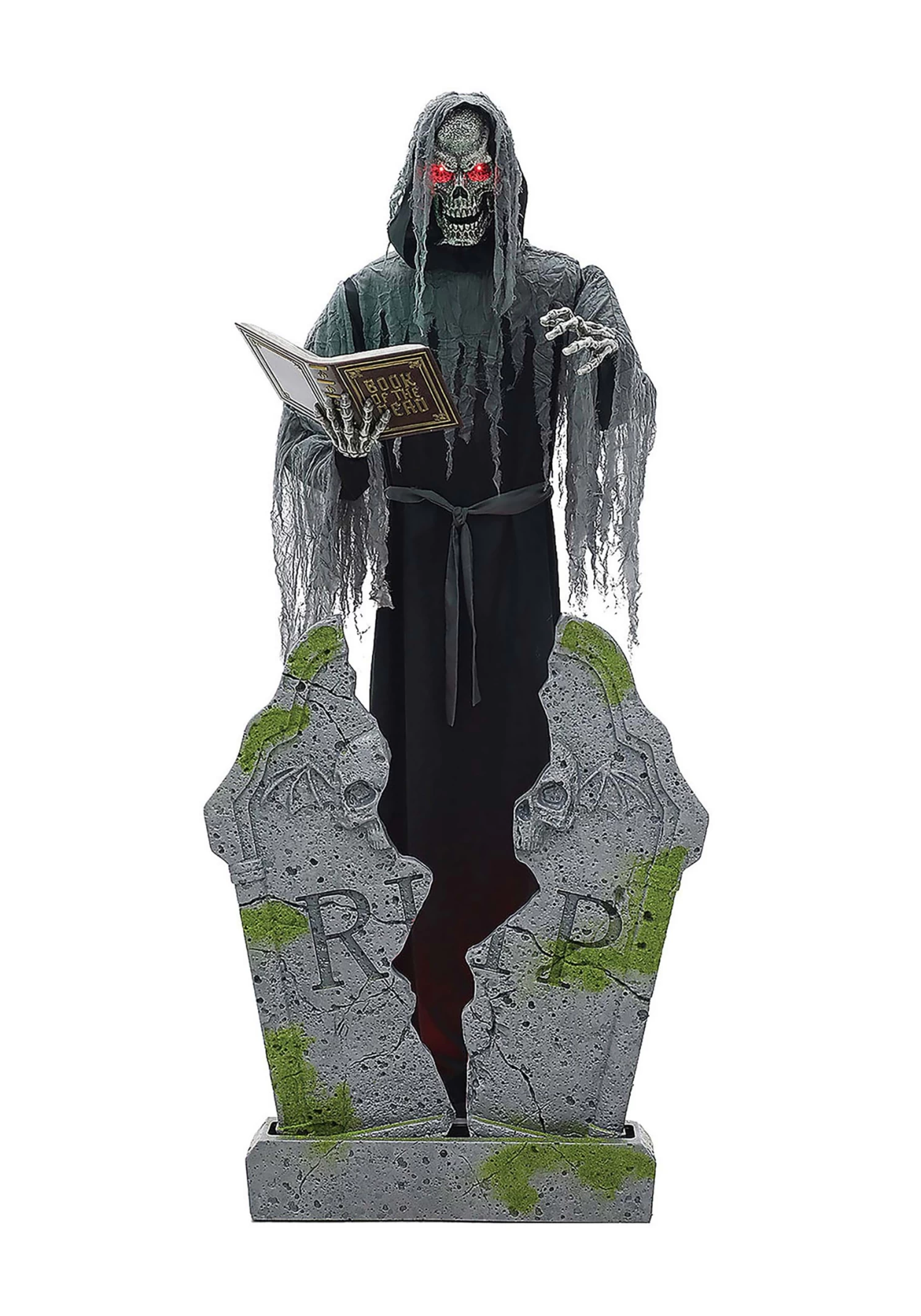 This seven-foot-tall animatronic is sure to make an impression on anyone who passes by your home this Halloween season. A wicked addition to your Halloween decor, the prop features a gravestone that cracks down the middle, a skeleton with glowing eyes, and a moving head and arm.