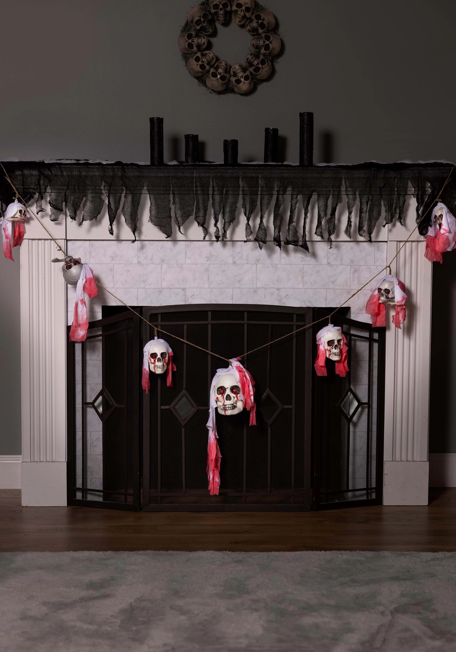 - Each skull is draped with gauzy mesh fabric with printed “blood” stains