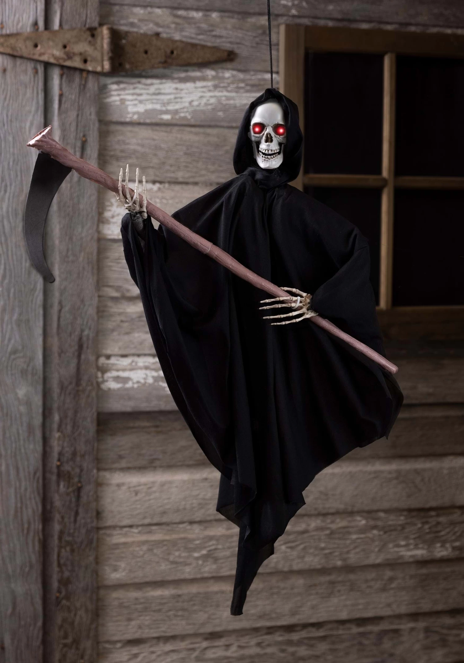 This three-foot-tall reaper is big enough to pack a punch and small enough to fit in a wide range of spaces such as porches, apartment windows, and front yard bushes. Running on batteries, this Reaper has glowing eyes and an eerie voice that’s sure to freak out anyone who passes by. The skull has a loop at the top of the head, making it a breeze to display anywhere you want to spread a little gloom and doom!