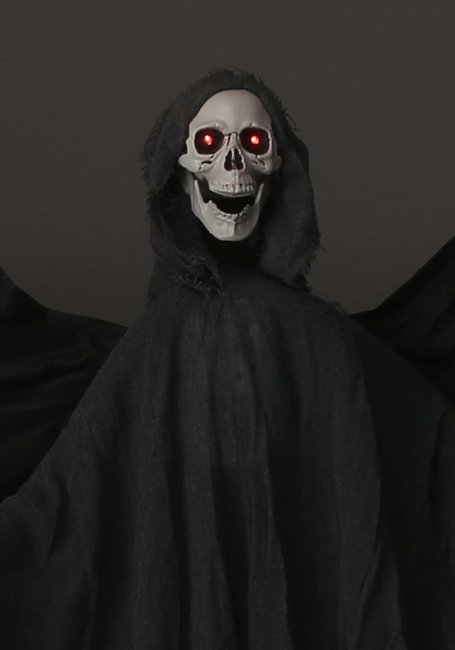 We’re not sure if there is really any truth to the legend of the black-winged terror, but we do know that you’re going to love the atmosphere you create when you bring this Animated Flying Reaper decoration home! This Made By Us prop is our exclusive design and brings two of the creepiest creatures out there together. The skull and skeletal hands create the image of a wrathful reaper, especially with the tattered black cowl! Red light-up eyes ensure this is a haunt that your neighborhood won’t soon forget. But when wind turns and the bat wings begin to join in the fun, you can expect that your house is not one anyone will soon forget!Â