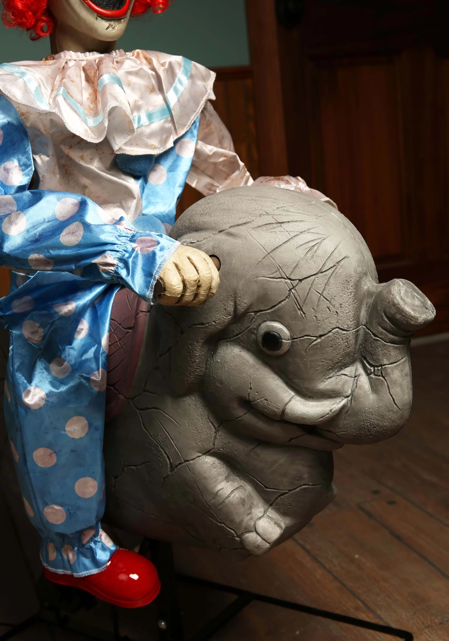 That’s how we stumbled upon the idea for this rocking clown on the back of a tiny elephant. We said, “If anything can work, it’s an Animated Rocking Elephant Clown!” And you know what? It did work. Our fake studies have shown that within moments of waking, babies that see this incredibly creepy rocking clown fall right back to sleep. We’re not sure whether it’s the cold vacuous eyes of the elephant, or the maniacal smile plastered on the clown’s creepy face, but, whatever it is, it works! We know that you’ll be satisfyingly creeped out too with this scary prop.