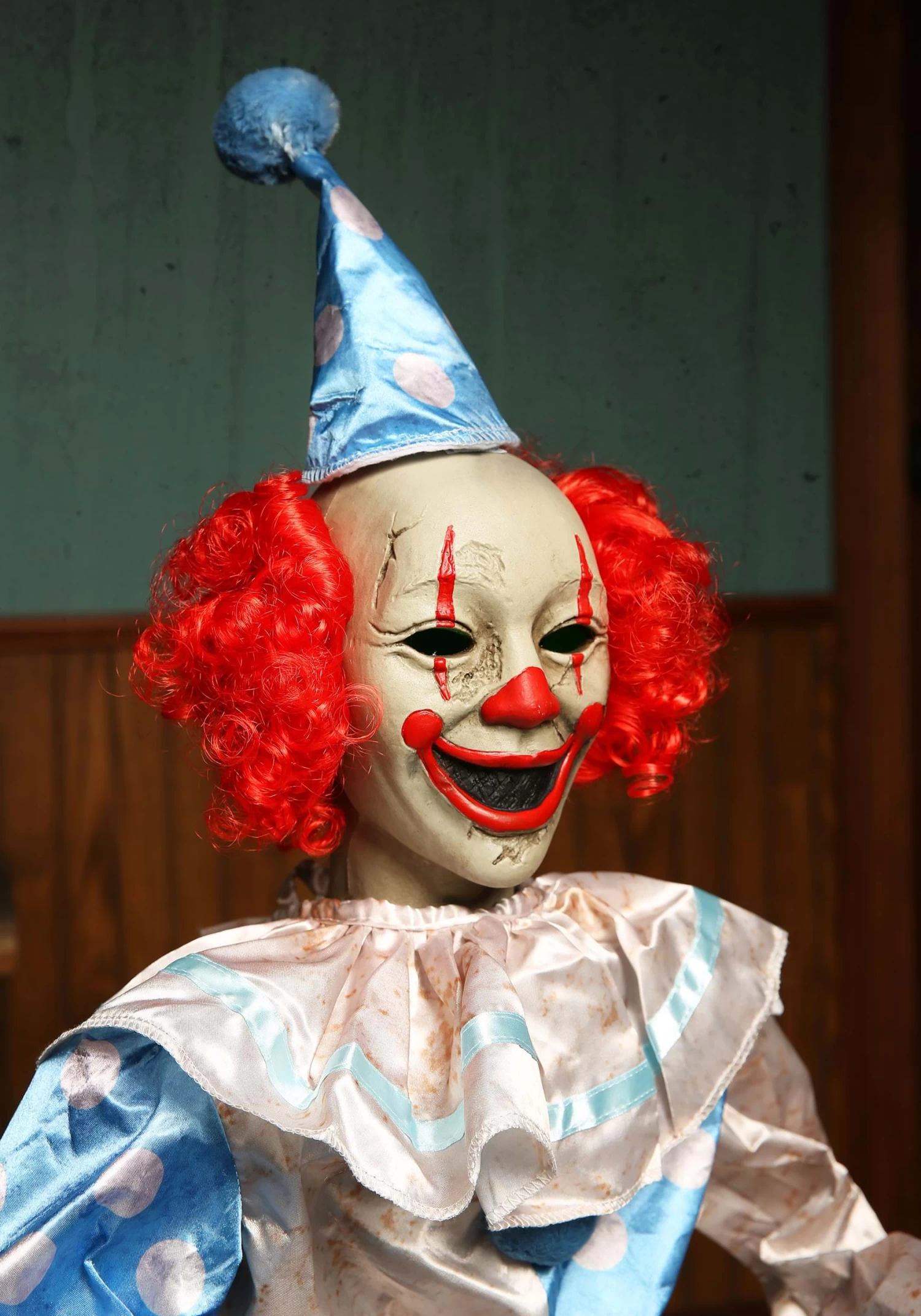 - Creepy clown with light-up eyes wearing an old rotted clown suit rocks back and forth