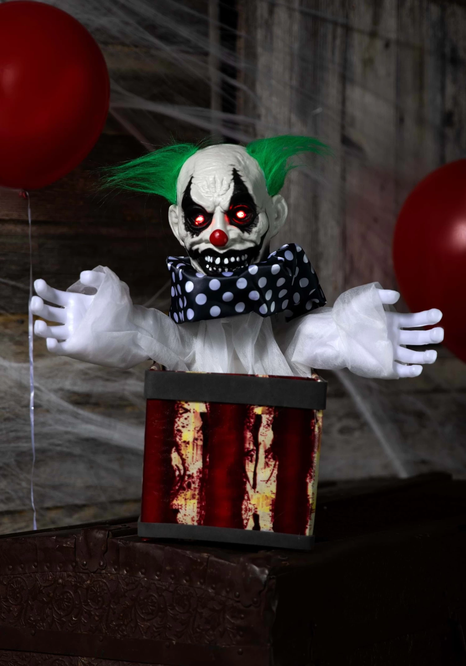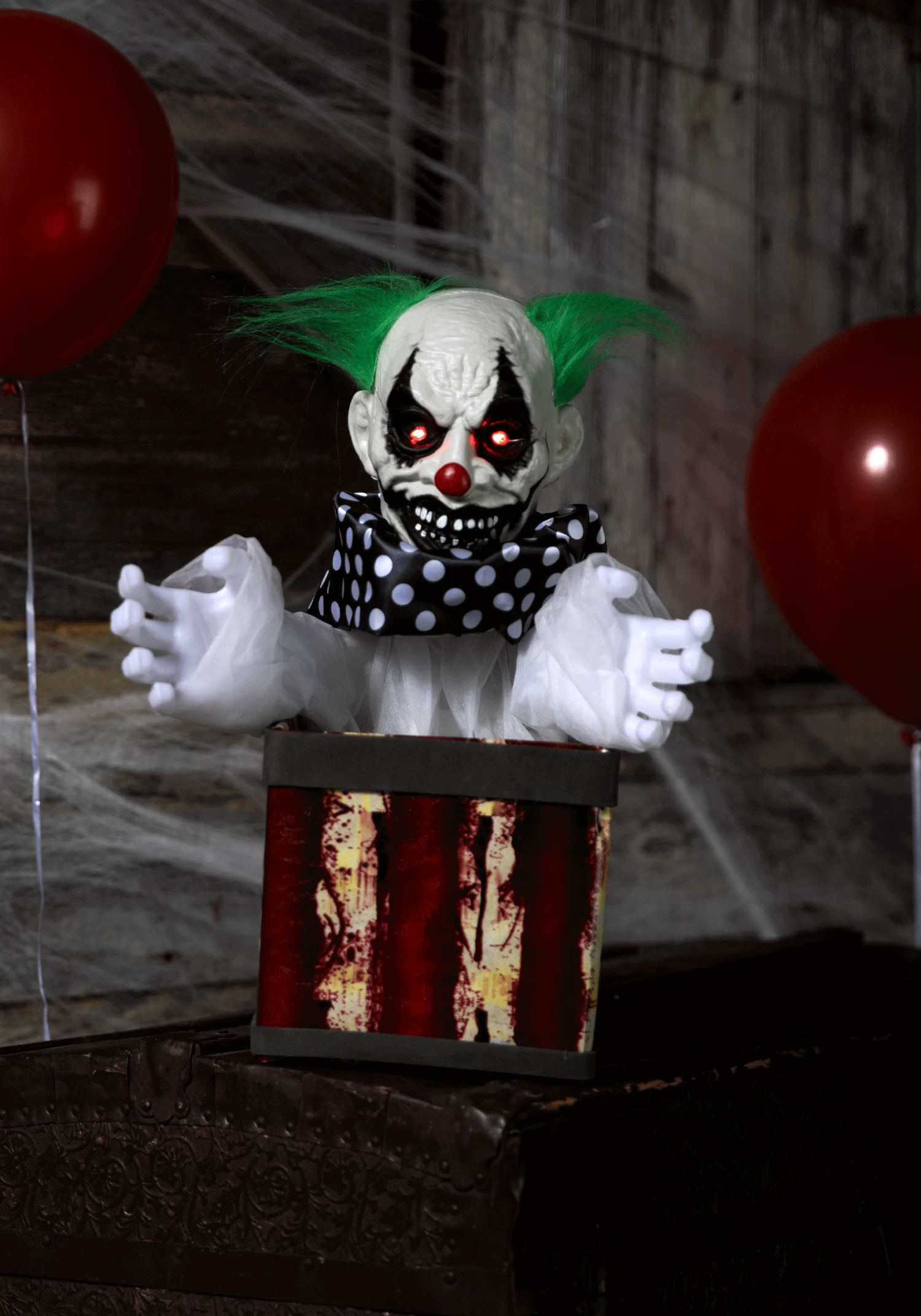 This Animated Clown in a Box is ready to fill the role! With his lime-green hair, pointy teeth, ghost-pale skin, this creepy clown will perfectly suit your needs. The red and white striped box, with its well-worn detailing, adds an extra distressing touch to your fun-house display. Three LR44 batteries make the clown come alive with sinister sounds, waving arms, and red light-up eyes. We hope you have full-sized candy bars for all the courageous kids that pass this frightening fellow.