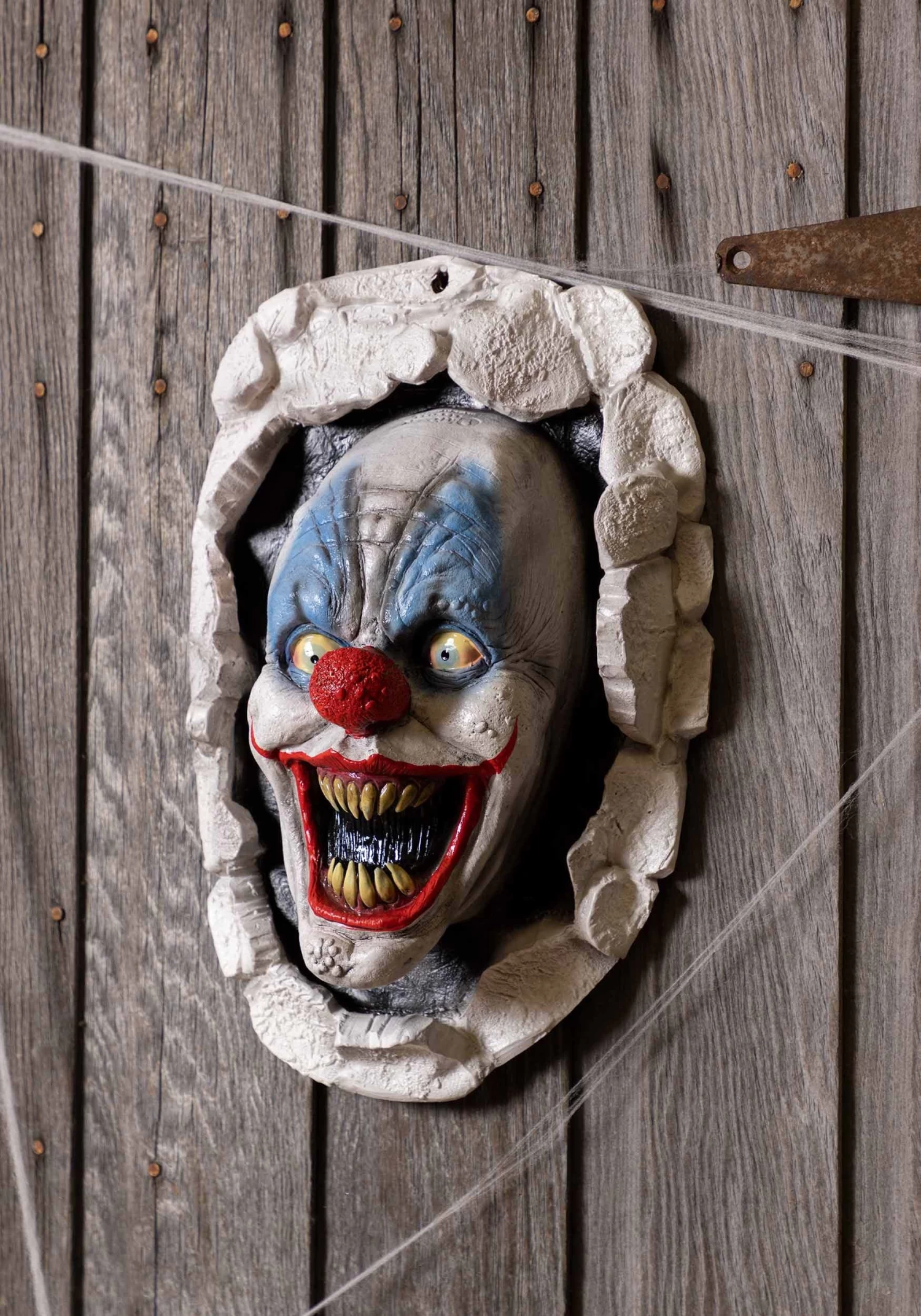 This Clown Wall Halloween Decoration looks like it’s asking to come in – don’t let it! The molded decoration can be attached to a flat surface to make it look as though a crazy-eyed clown with businesslike fangs has just busted through your drywall.Â