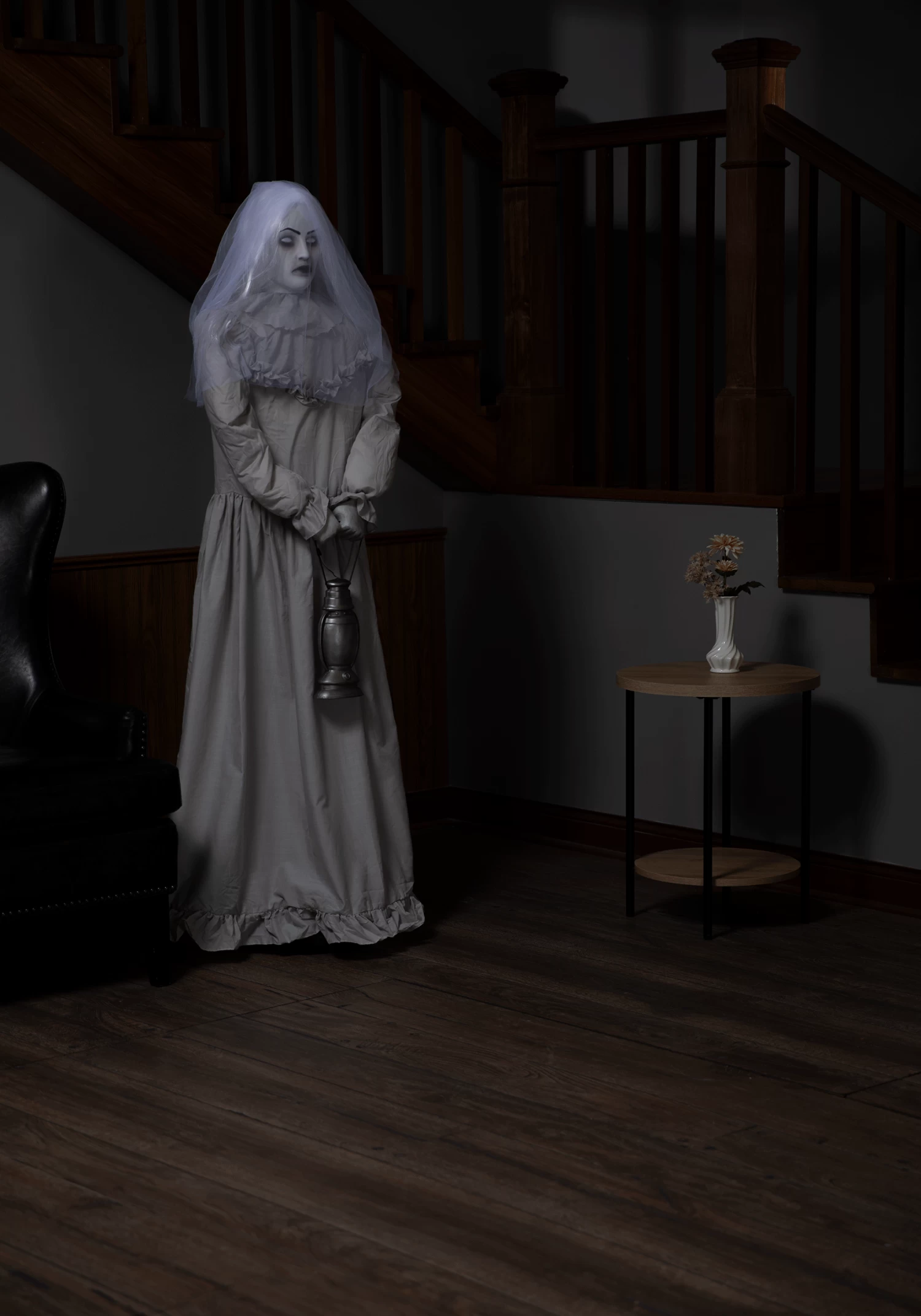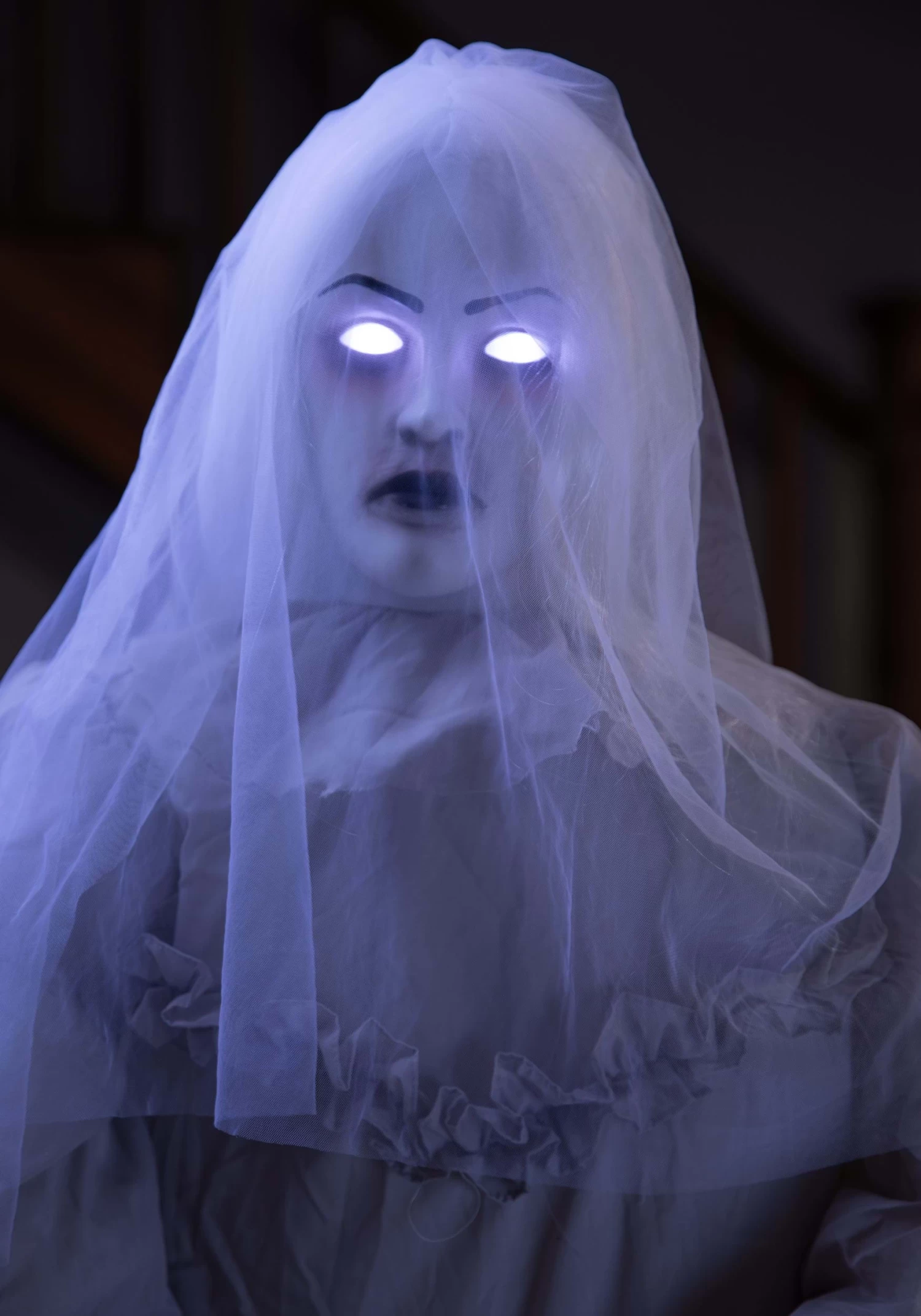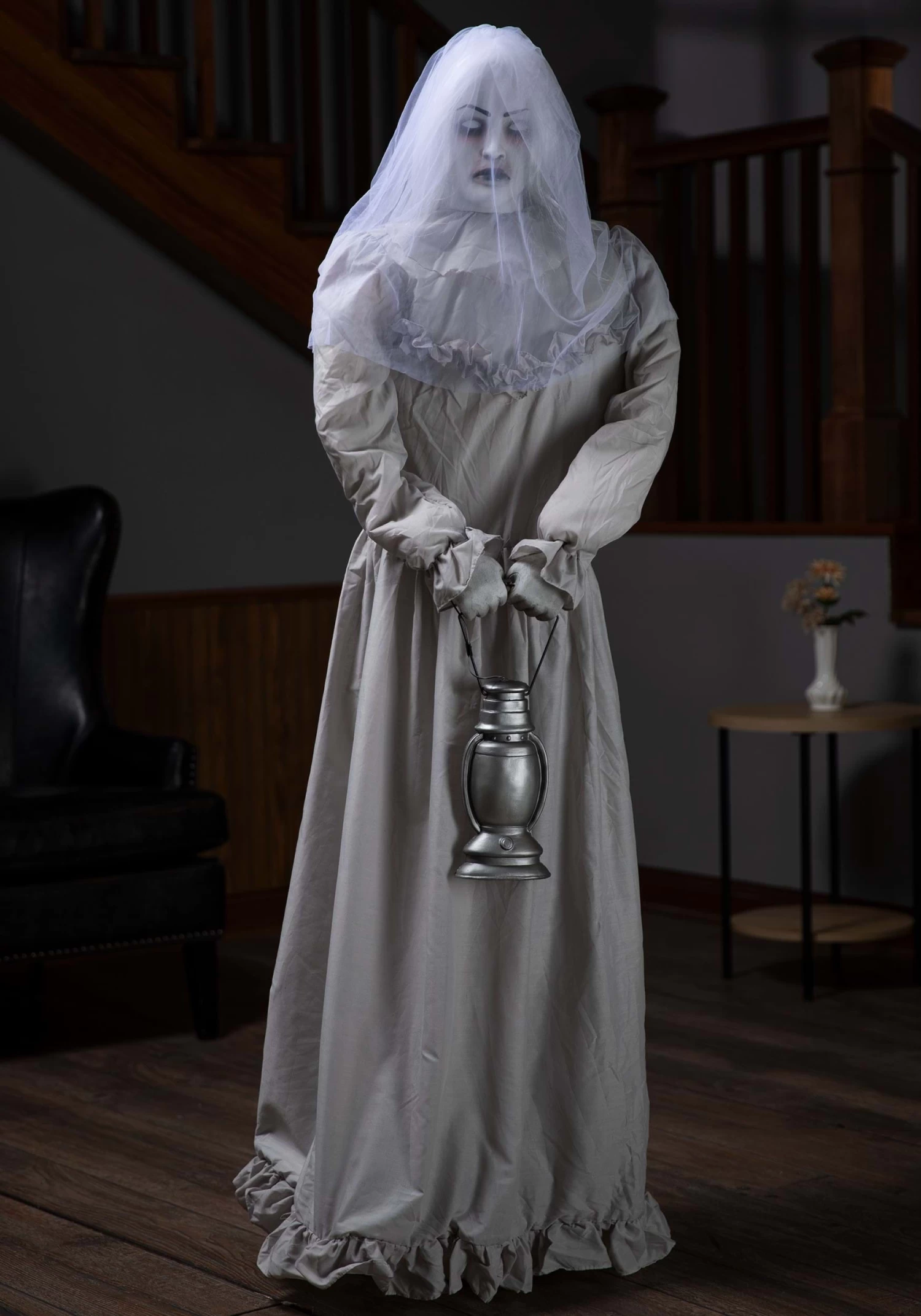 Show the neighborhood your Halloween spirit with this 5-foot Floating Ghostly Lady! Fresh from her moaning and groaning tour of your home, this lady in white is ready to share a scare with people who haven’t adjusted to her constant presence as you have. With her glowing eyes and vintage lantern, she makes a perfect decoration on your front porch or behind dark windows. And whether you believed before or only after meeting this ghoulish gal, she’s sure to earn a special place among your Halloween celebrations and heart!