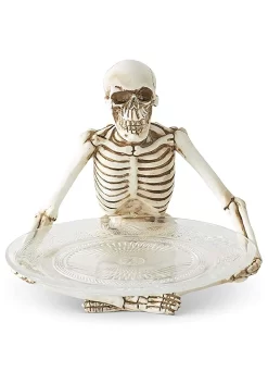 10-Inch Resin Sitting Skeleton Holding Glass Plate Decoration