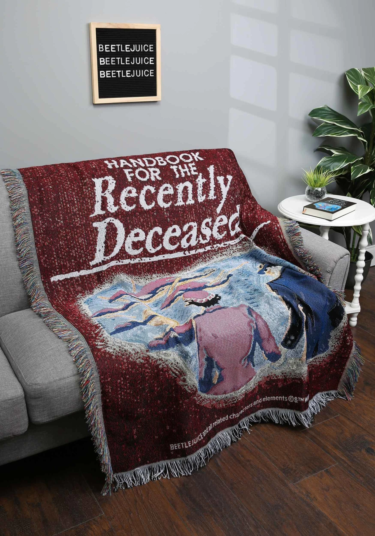 Well, we think that the dead would definitely be using this Handbook for the Recently Deceased Tapestry Throw, which is officially licensed from the Tim Burton classic, Beetlejuice.