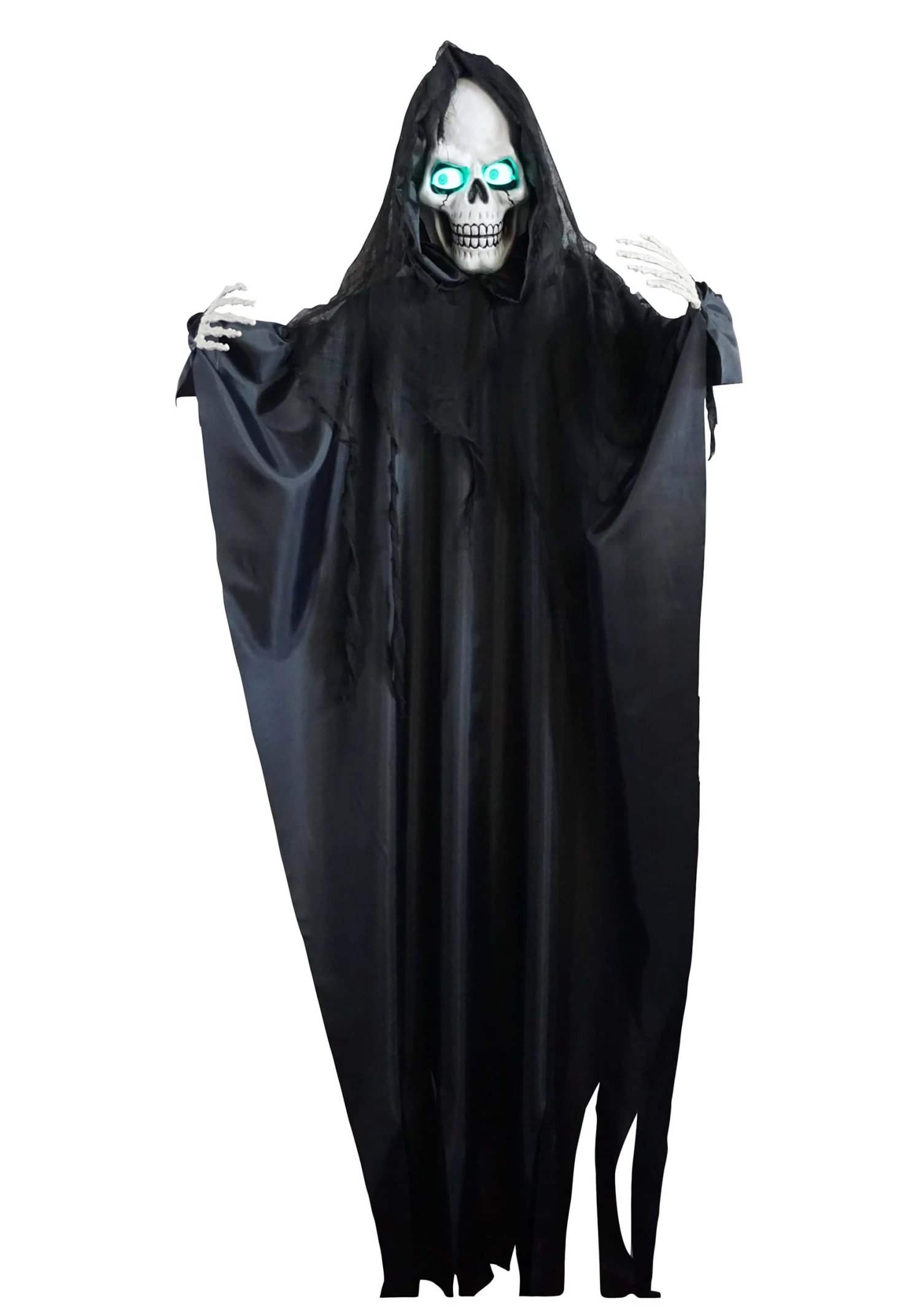 This figure hangs well from a high beam, hook, or tree branch, and measures almost 6 feet tall! He’s draped with a gauzy black hood and tattered black cloth and his eyes light up (once the batteries are installed).Â
