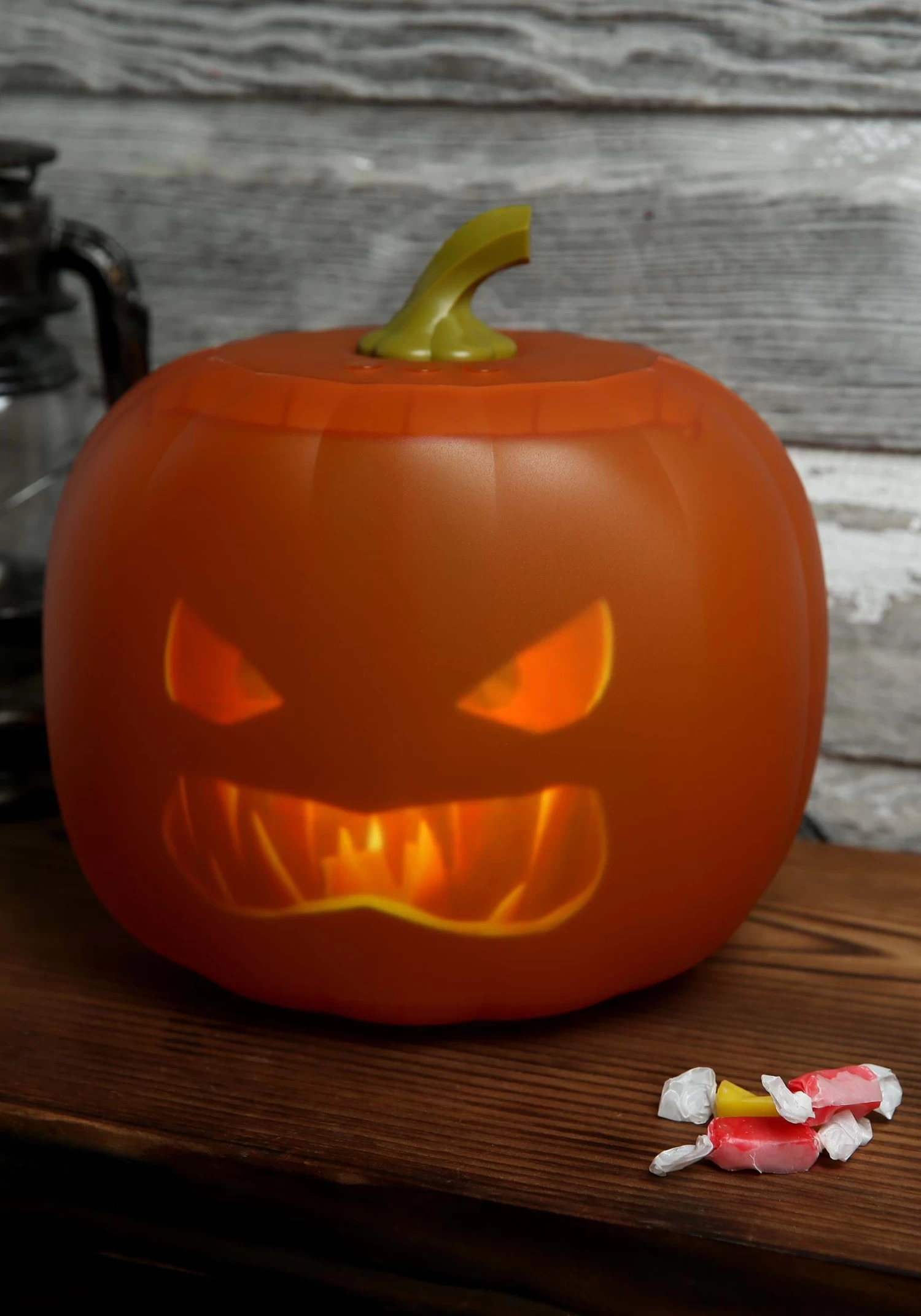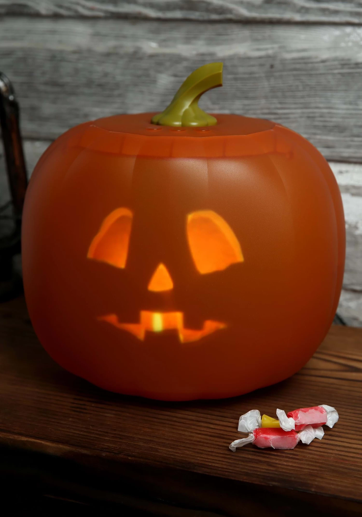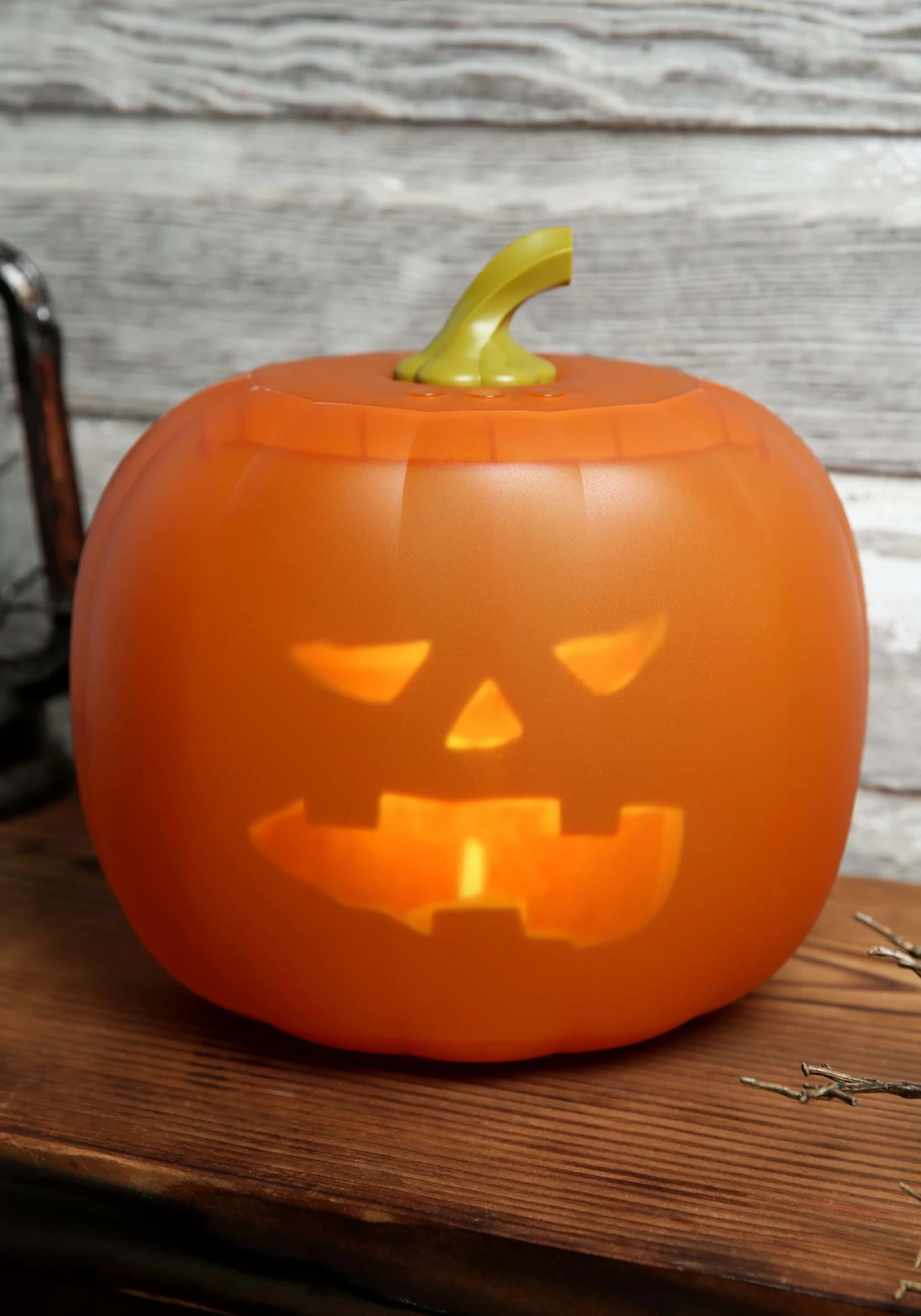 - Plastic pumpkin measures approx. 11″ diameter, 11″ tall