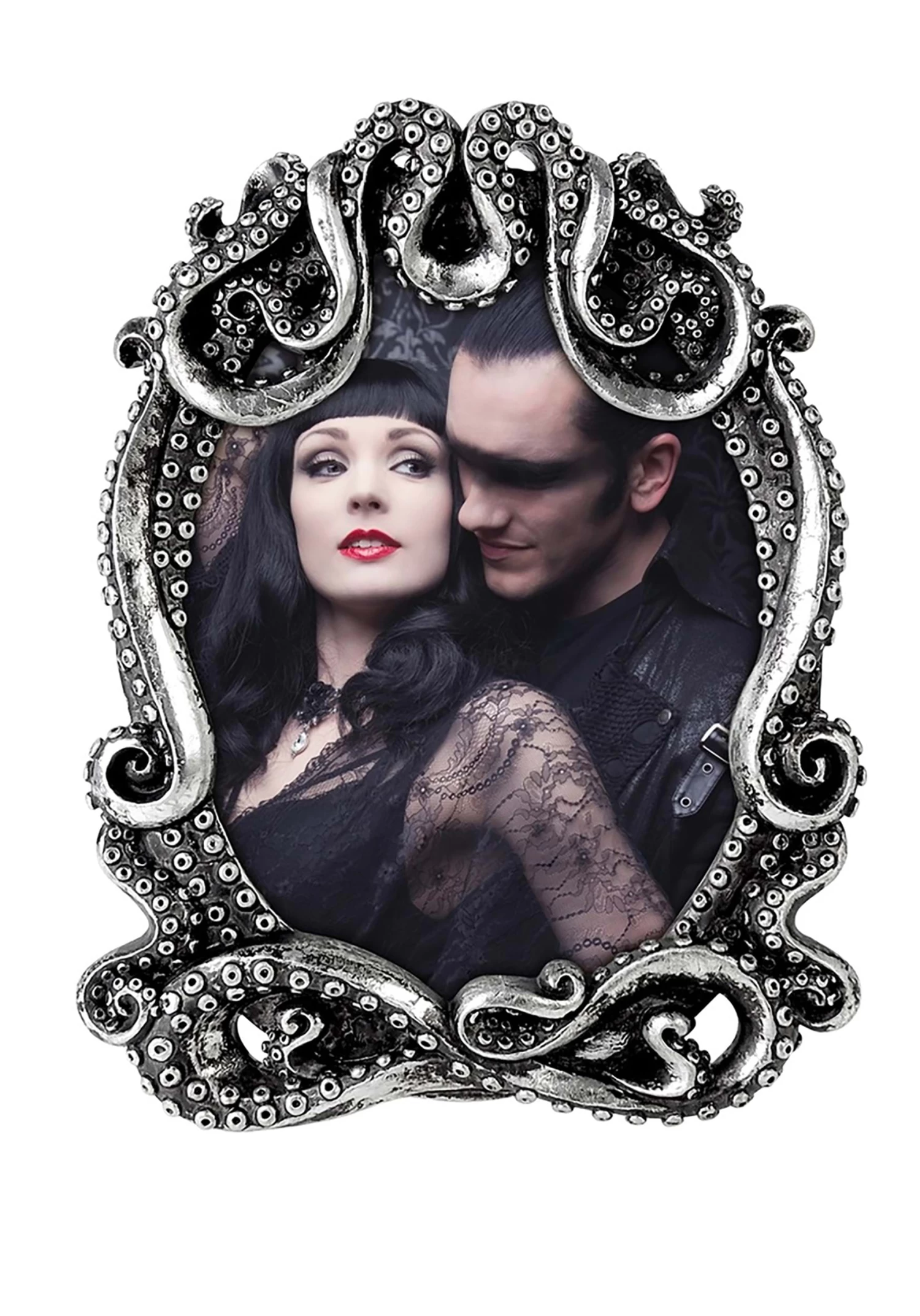 Add some dark whimsy to your favorite photo with this Kraken Photo Frame! The silver-tone oval frame is molded to look as though suction-covered tentacles are draped all over the picture. It’s perfect for fantasy lovers and ocean enthusiasts!Â