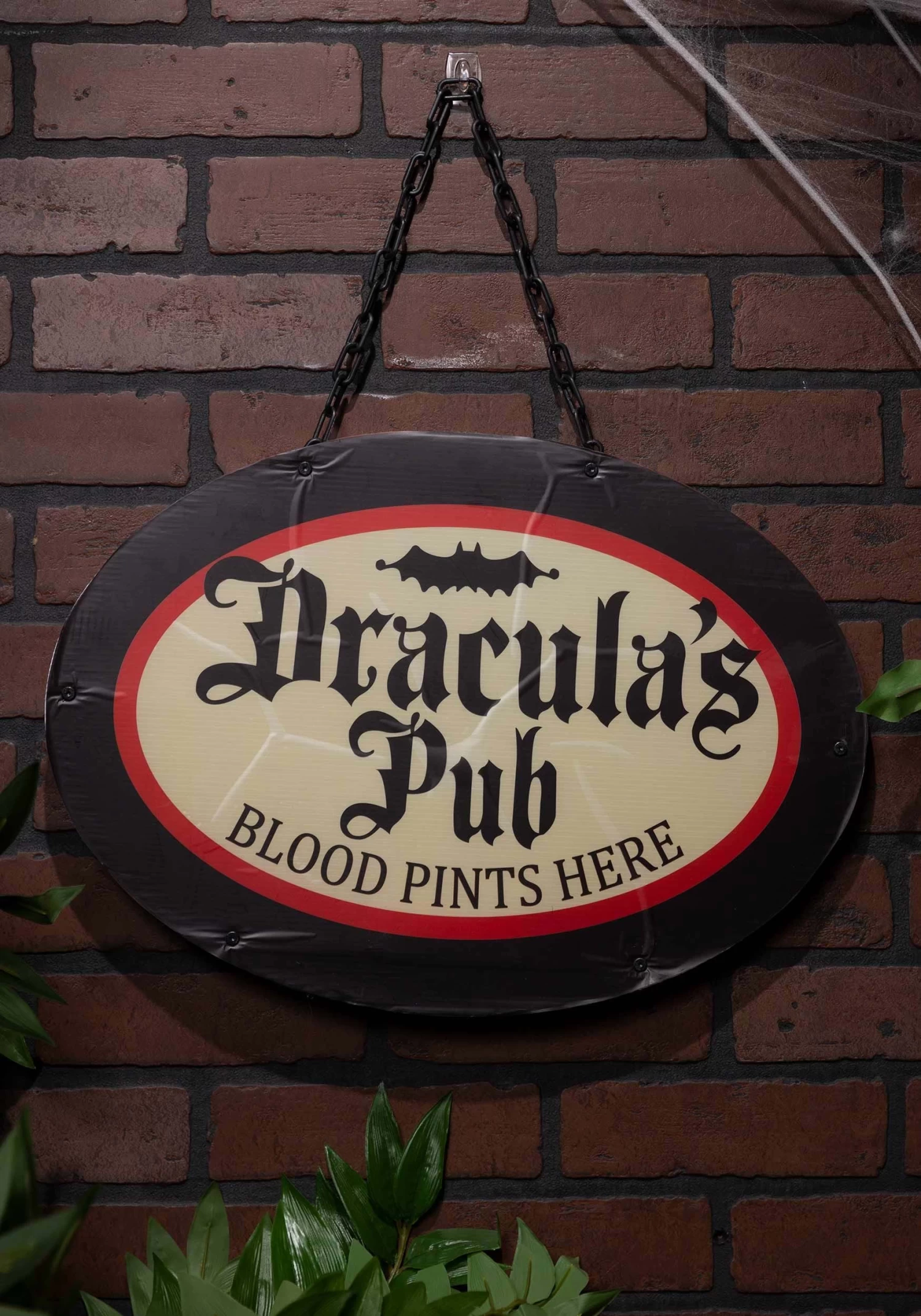 Let your guests know to expect a scary good time when you hang up this Light Up Hanging Dracula’s Pub Sign! The oval-shaped plaque has a chain attached to the top and is printed with the words “Dracula’s Pub: Blood Pints Here.”Â