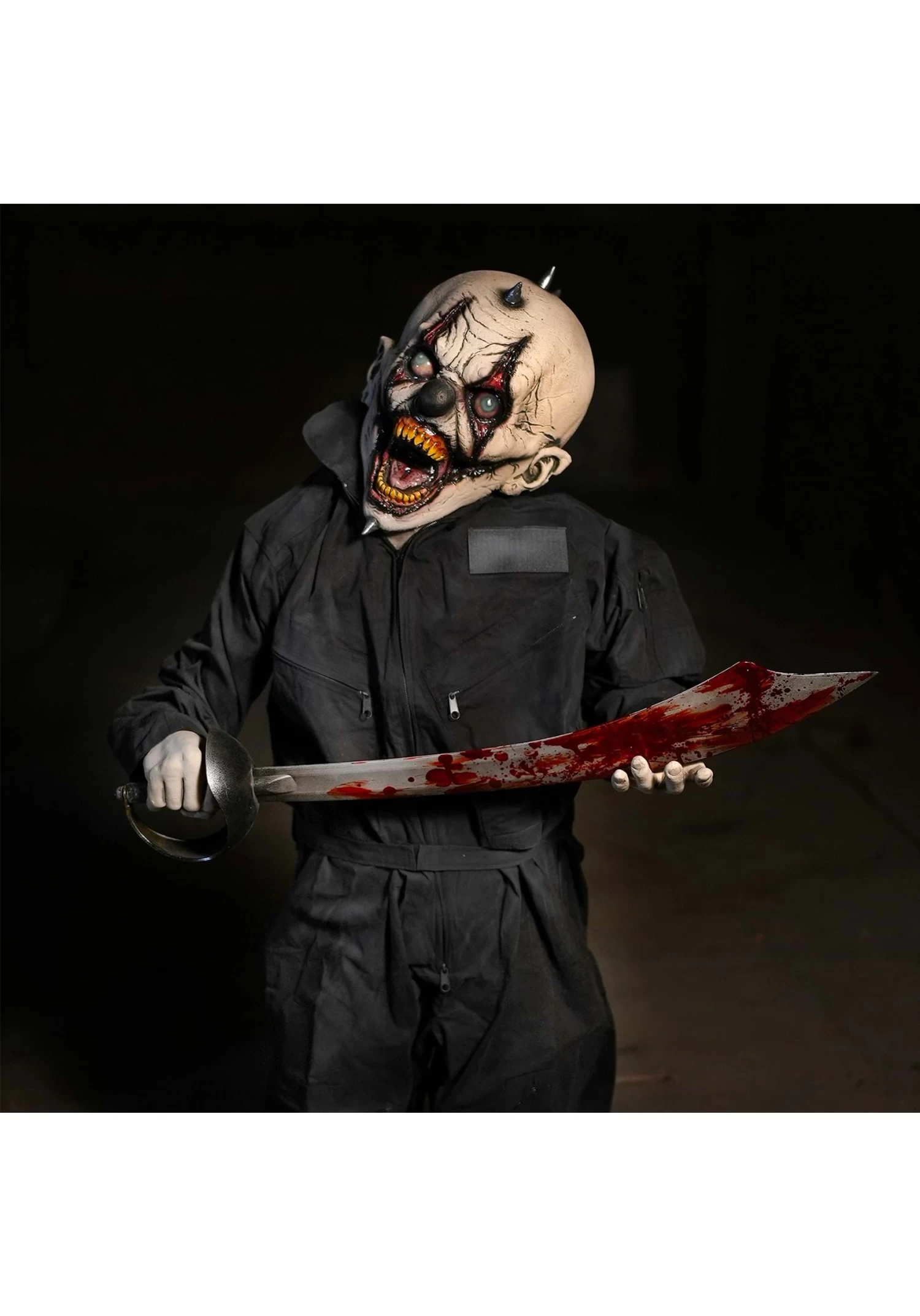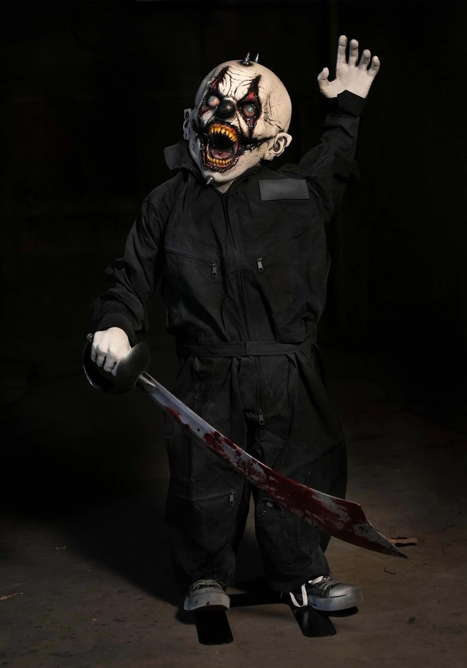 Your friends and family will shriek at the sight of this petrifying Little Creep Clown Prop! The small figure wears a dark jumpsuit and holds a long, curved blade that’s stained with faux blood. Its snarling face is painted with clown makeup.Â