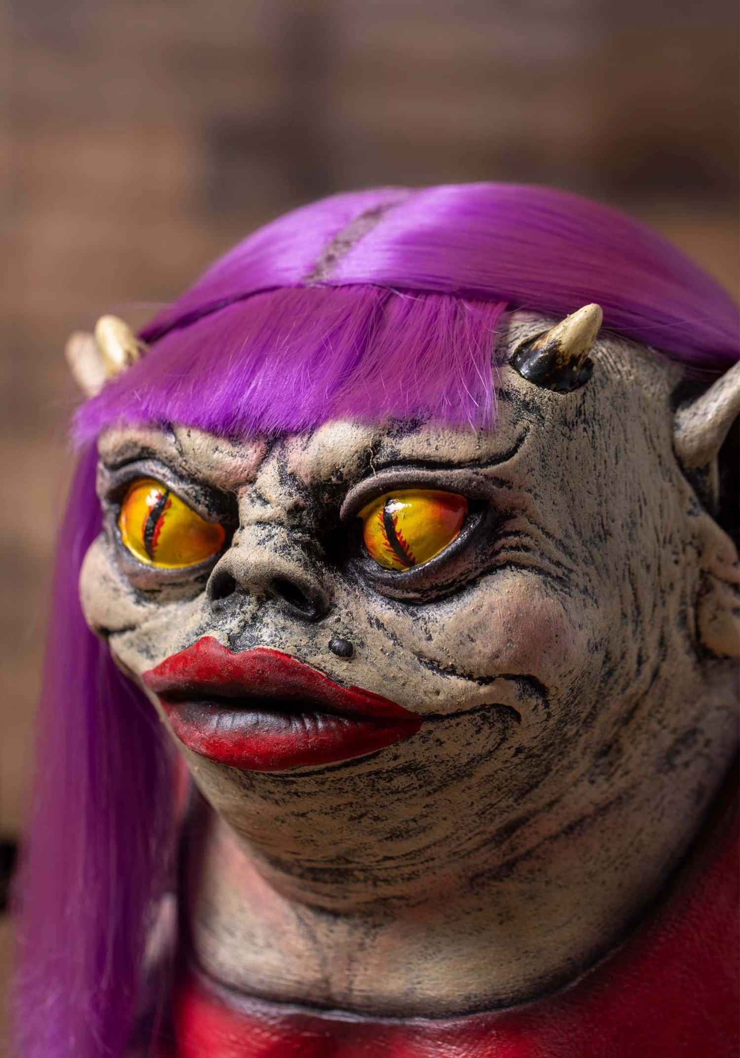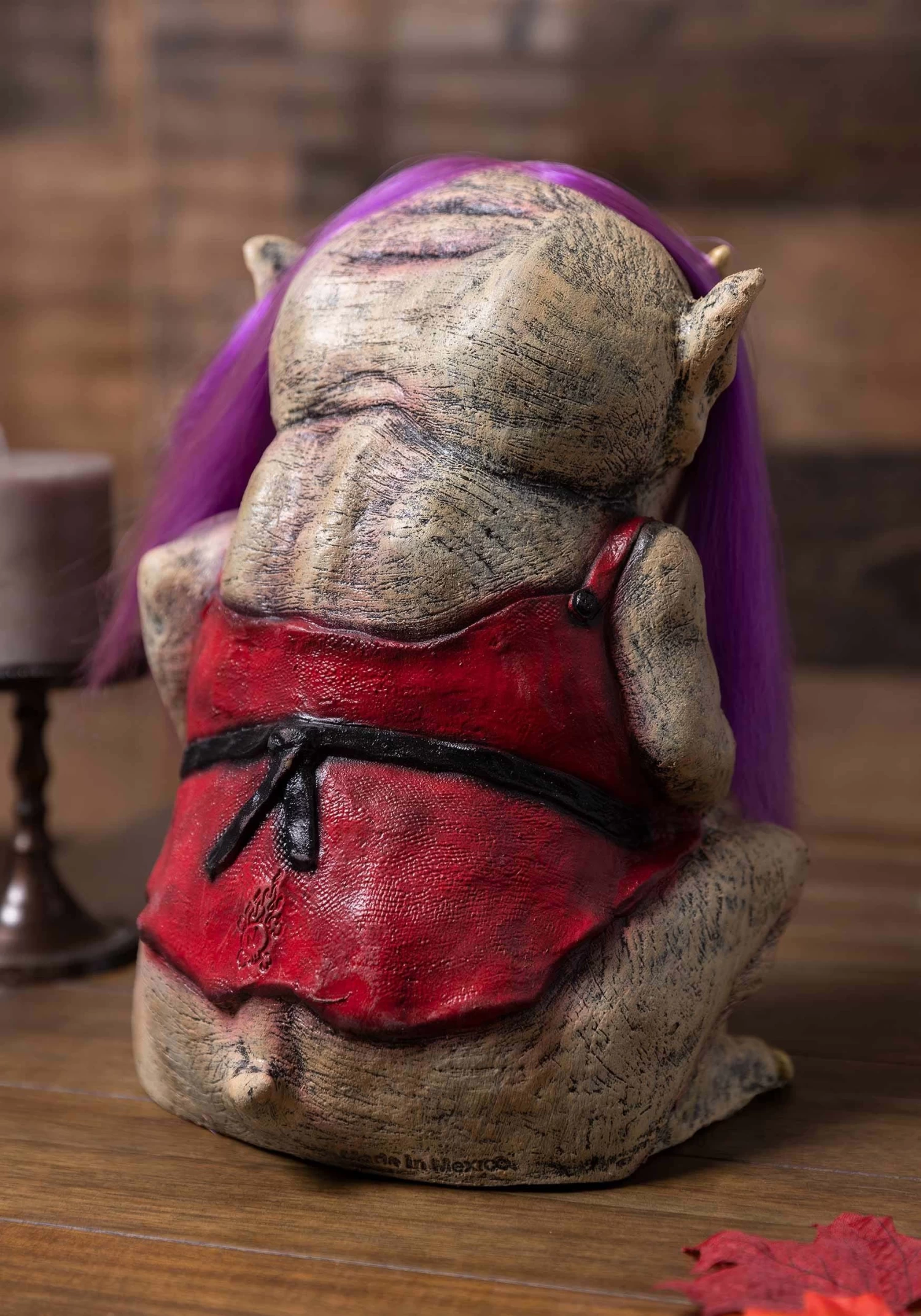 Monsters like style too, you know. Just because you’re the evil familiar of a creepy wizard doesn’t mean that you can’t play to your fashion strengths. This Mrs. Little Monster Prop has gone all out to show her flair for the dramatic. The molded vinyl figure’s yellow eyes and jutting horns are a sharp contrast to her red dress, bright lipstick, and synthetic fuschia hairdo. At twelve inches tall, she’s the perfect size for displaying on a shelf, table, or porch. Compliment her outfit and she might refrain from eating you.Â