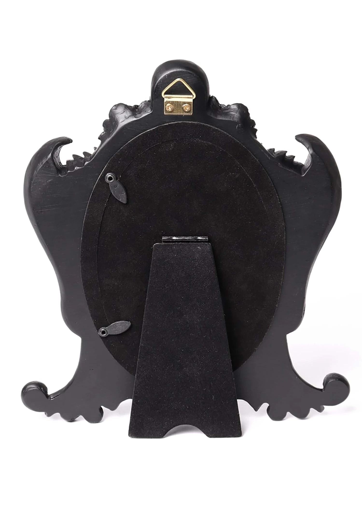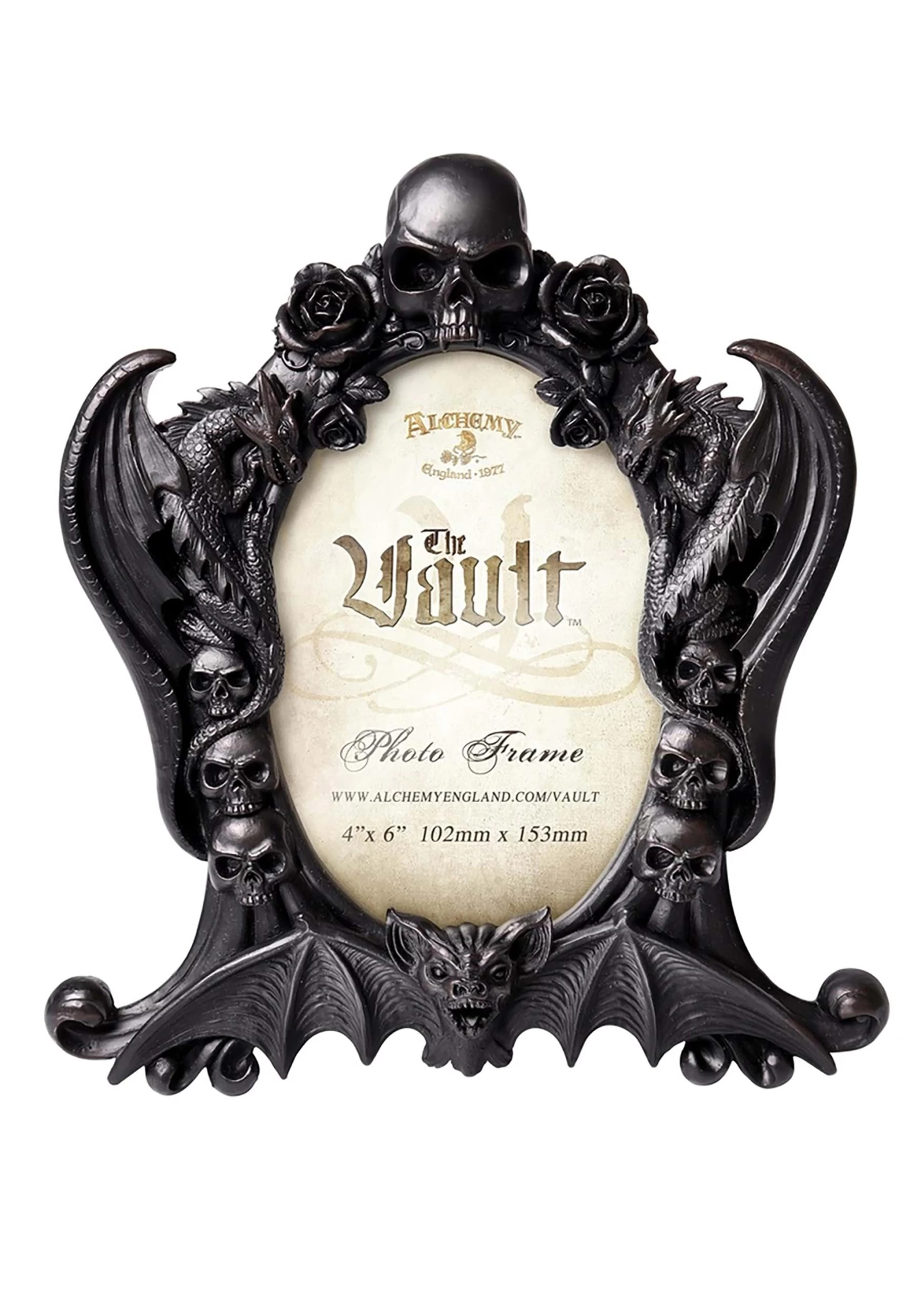 The family picture wall is such a lovely trip through the past. We have so many wonderful memories captured in these frames. Here is where we got our first pet. Here is us waving from the edge of the Grand Canyon. Here is where we both became certified necromancers and detonated a ragged hole into the netherworld. Such fun! This Nosferatu Picture Frame will lend a sinister gothic air to any picture you showcase inside it. The molded black frame includes depictions of skulls, roses, dragons and a snarling bat.Â