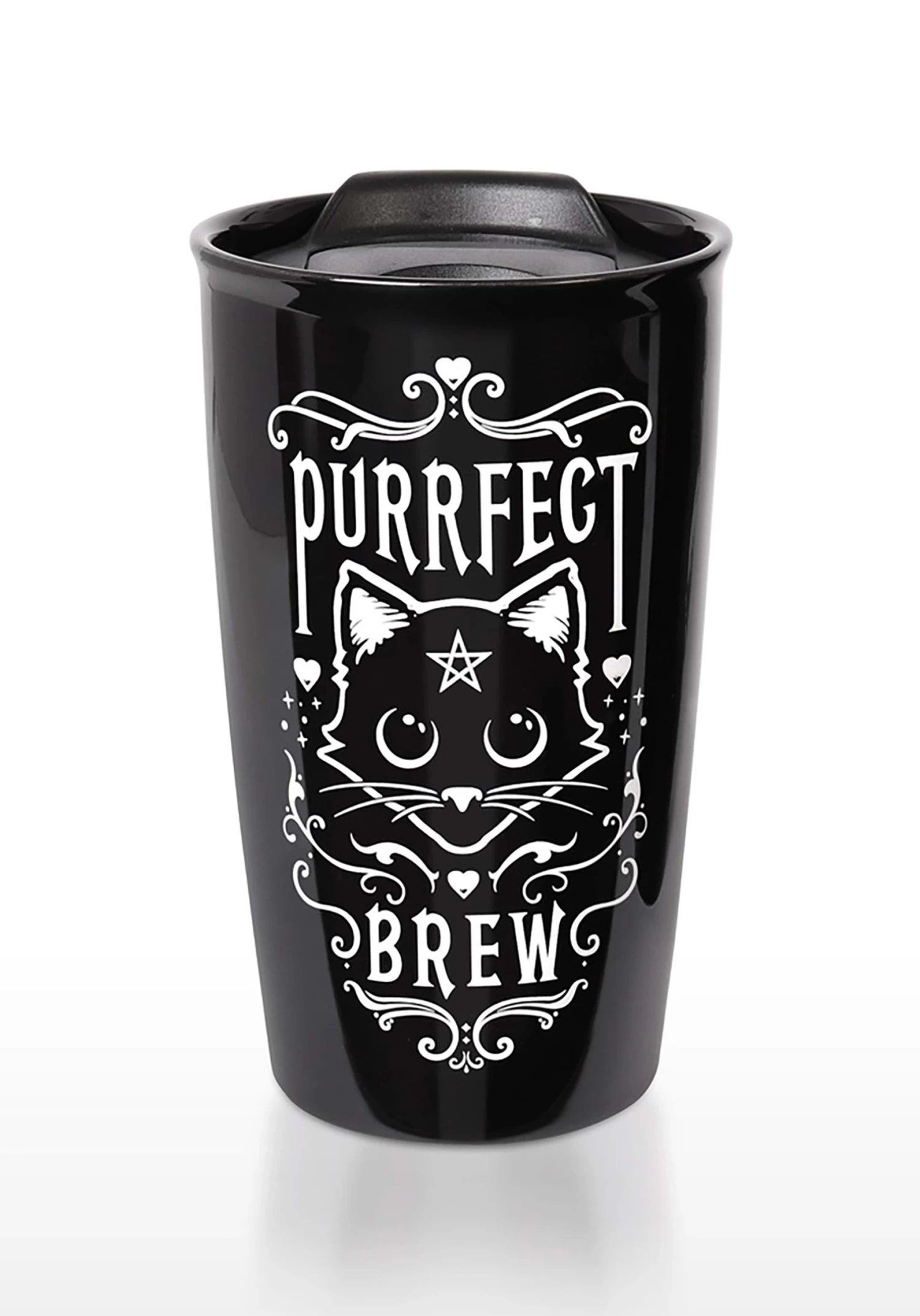 Your black cat familiar can’t travel with you everywhere, but your coffee sure can! Add a touch of magic to your commute, your class, your workspace, and your social events when you use this Purrfect Brew Double Walled Travel Mug. The fun graphics on the outer front will make you smile, while the secure design keeps your drink at the ideal temperature.Â
