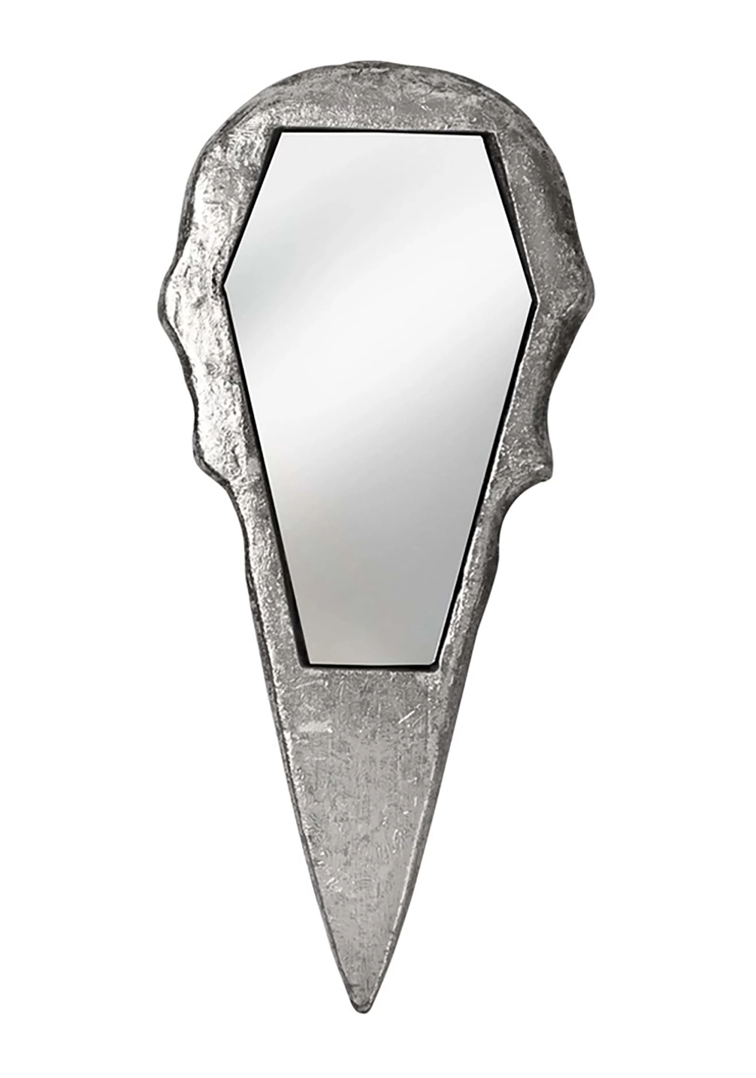 Give your home or office a spooky upgrade with this Raven Skull Silver Hand Mirror! The molded silver-tone mirror is shaped like a raven’s skull, complete with stylized “cracking” details. When flipped over, it reveals a coffin-shaped mirror. Perhaps you will spot your lost Lenore within its depths?Â
