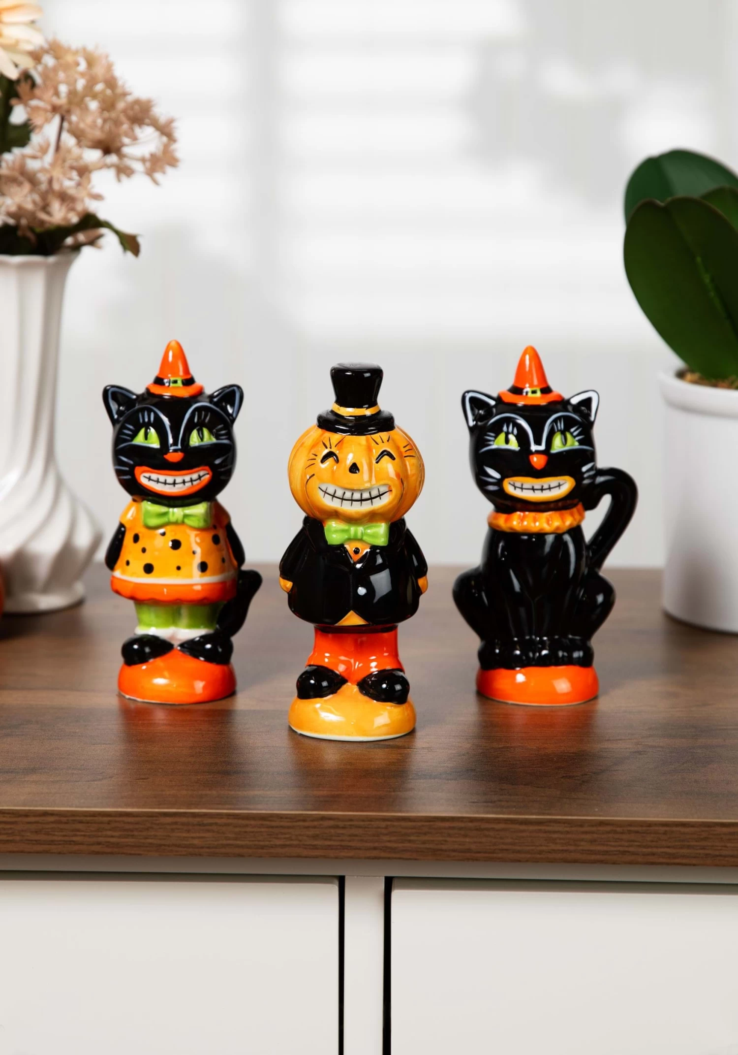 This Set of Three 6 Inch Vintage Inspired Halloween Figures is an eye-catching group! The three resin figurines are brightly painted with retro shades of orange, green, off-white and black. Two are shaped like grinning black cats wearing witch hats, and the third resembles a smiling, pumpkin-headed figure in a top hat and bowtie.Â