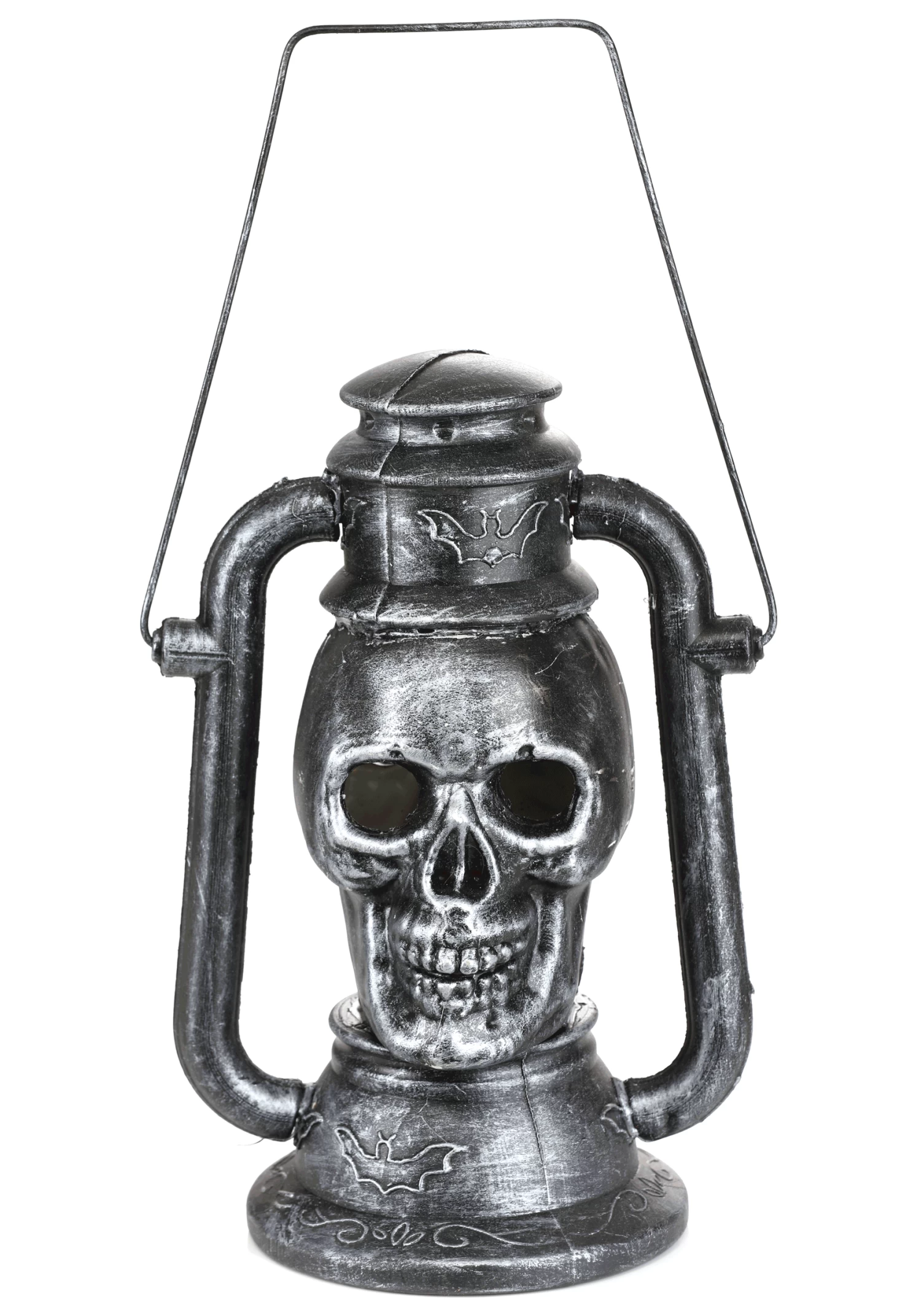 Light the night with an exclusive Silver skull Lamp with 3 Color LED Light Up Eyes! The plastic lamp is shaped like an old-fashioned lantern and is the color of tarnished silver. The center is shaped like a grinning skull. Its inner cavity is fitted with LED lights that flash red, green, and blue.Â
