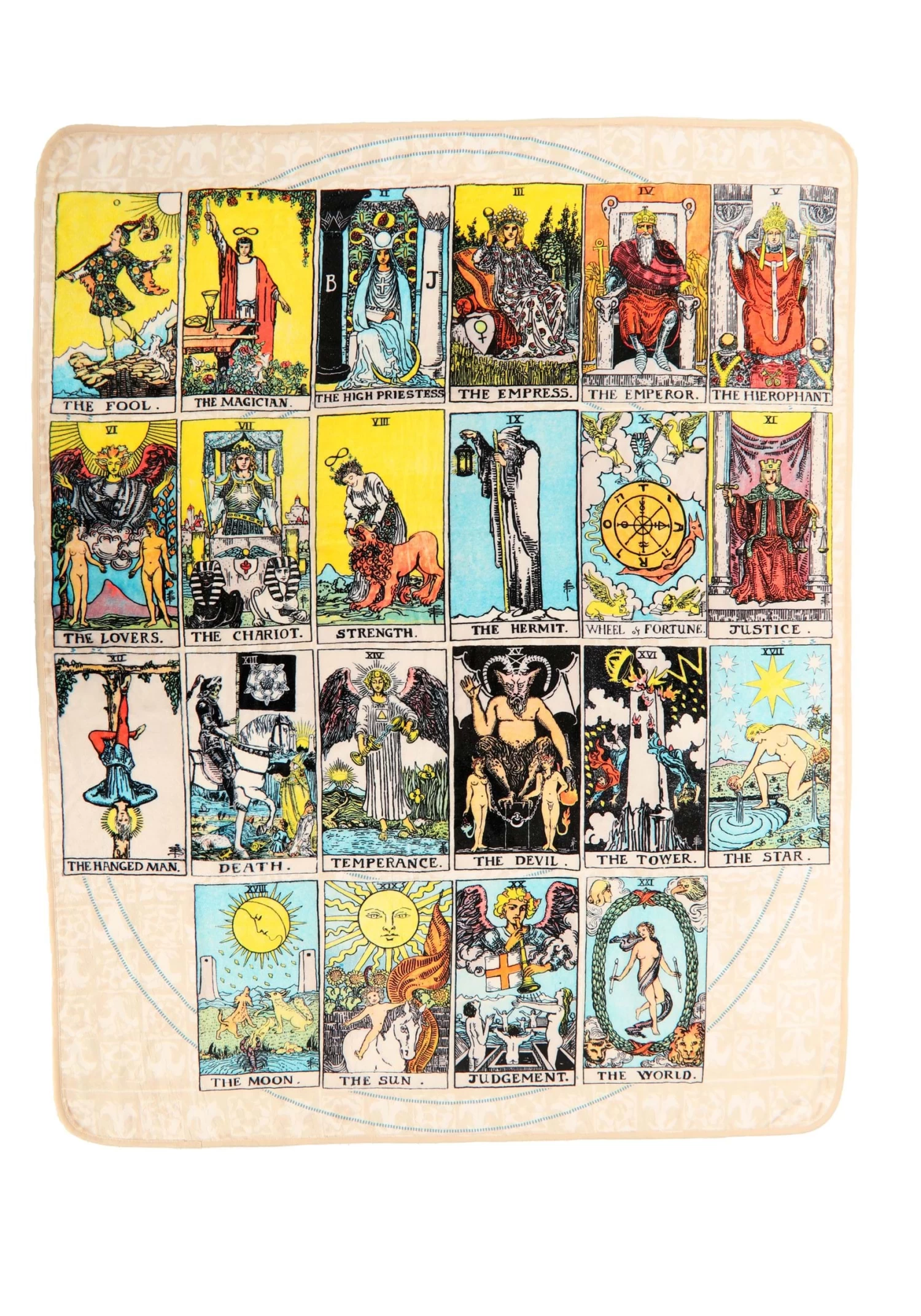 The throw blanket features a printed image of tarot cards, while the back is solid white. It measures roughly 60″ x 48″ and will fit nicely on your lap as you draw your tarot suit.