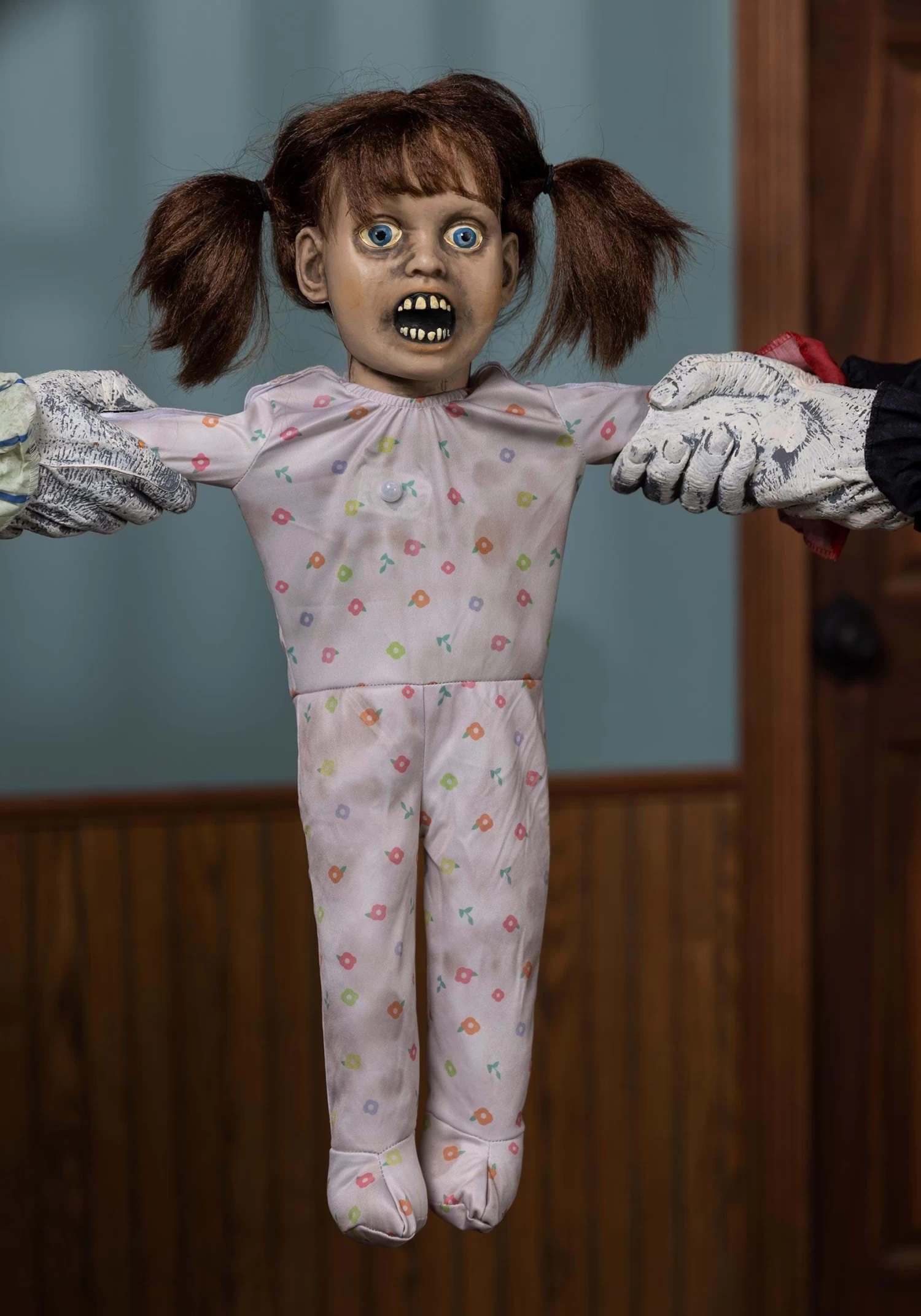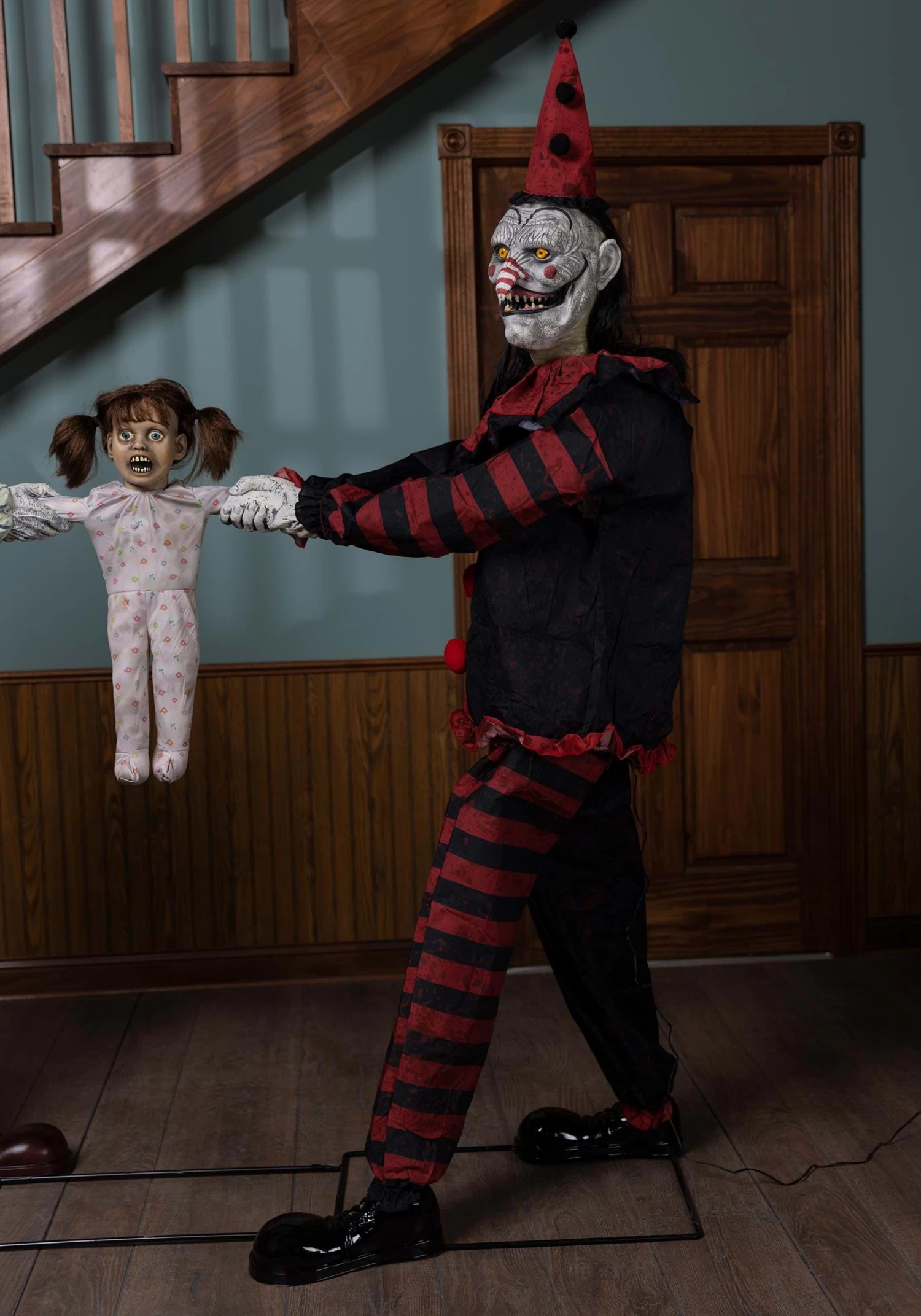 Terrify visitors with this frighteningly realistic Tug of War Animated Clown Prop! The two clowns stare at onlookers as they wrestle over a clearly panicked child. The clowns are wearing striped and polka-dotted clothes and big shoes, and their haunting faces have sinister makeup. They come with a sturdy stand so that you can display them anywhere.Â