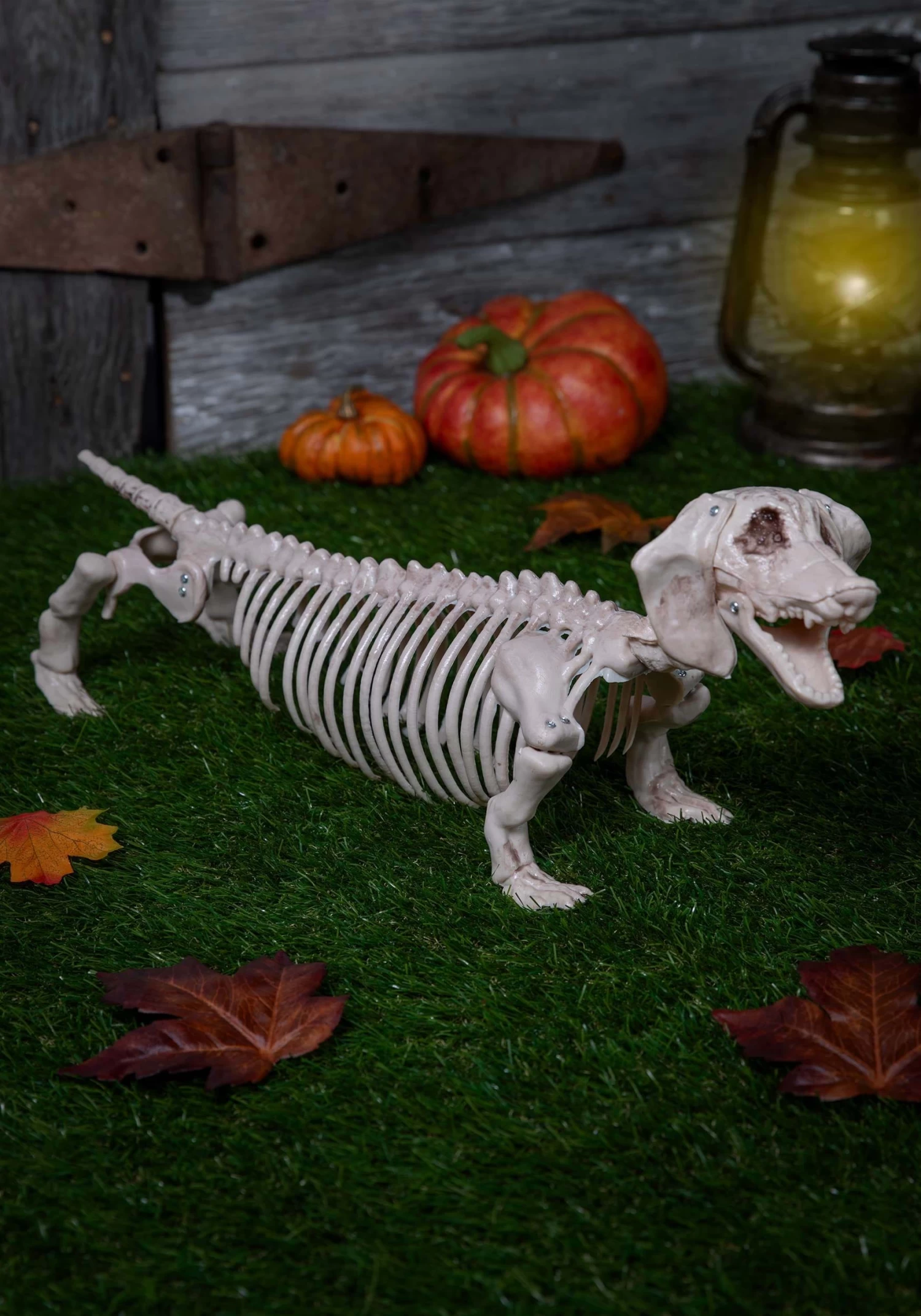 This frightening Fido is actually just a Weiner Dog Skeleton Decoration! The plastic skeleton stands sturdily on all four legs, and its head is embellished with ghostly ears.Â